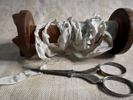 1/2" Crinkle Ribbon - 2 yards - Faint Blue China. Dames of the Needle. Hand dyed. Not colorfast. Color may vary from photo. Great for finishing needlework or other textile arts. Spool and scissors are not included.