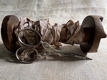 1/2" Crinkle Ribbon - 2 yards - Mermaid's Firewood. dames of the Needle. Hand dyed. Not colorfast. Color may vary from photo. Great for finishing needlework and other textile arts. Spool and scissors are not included.