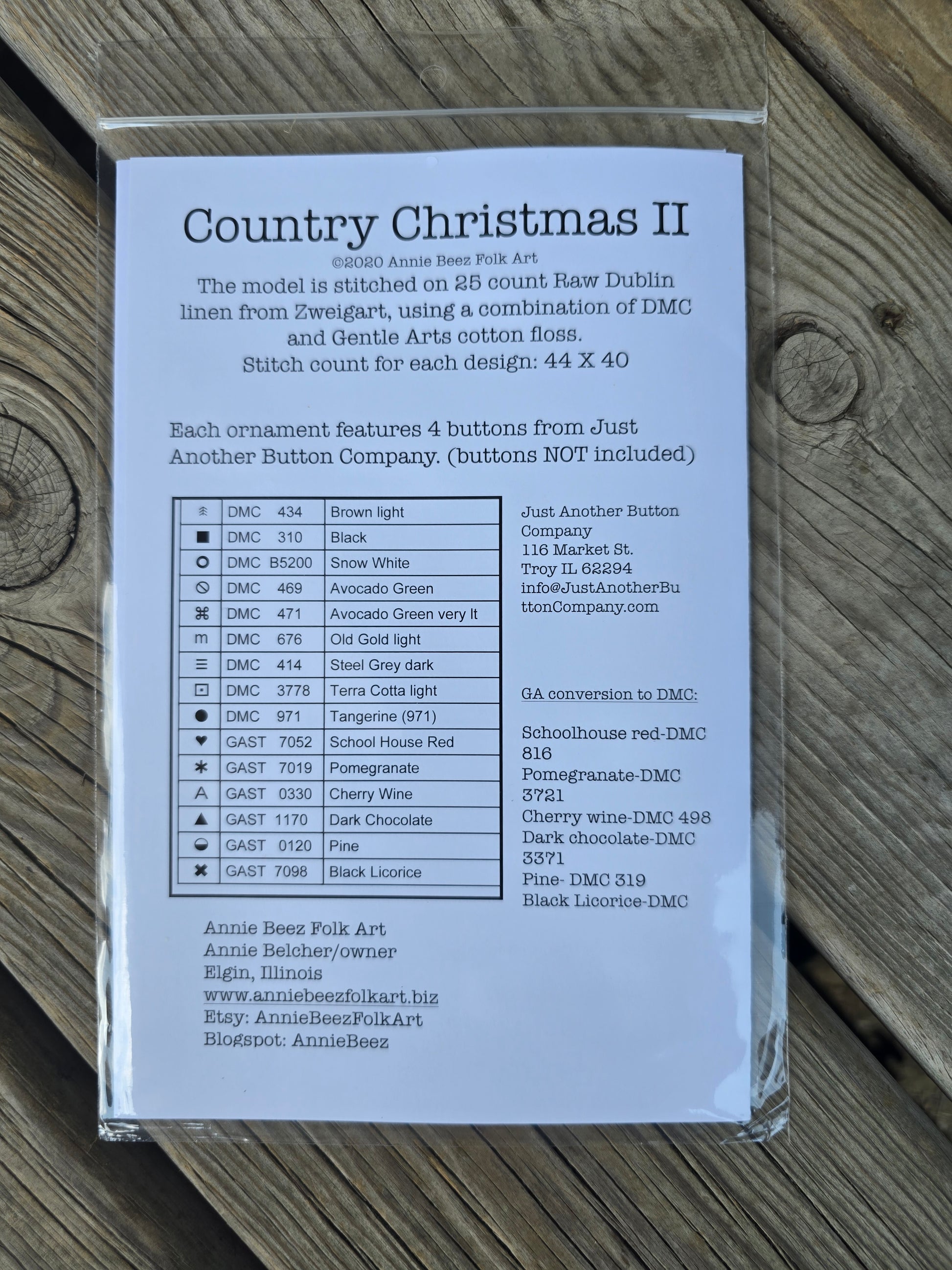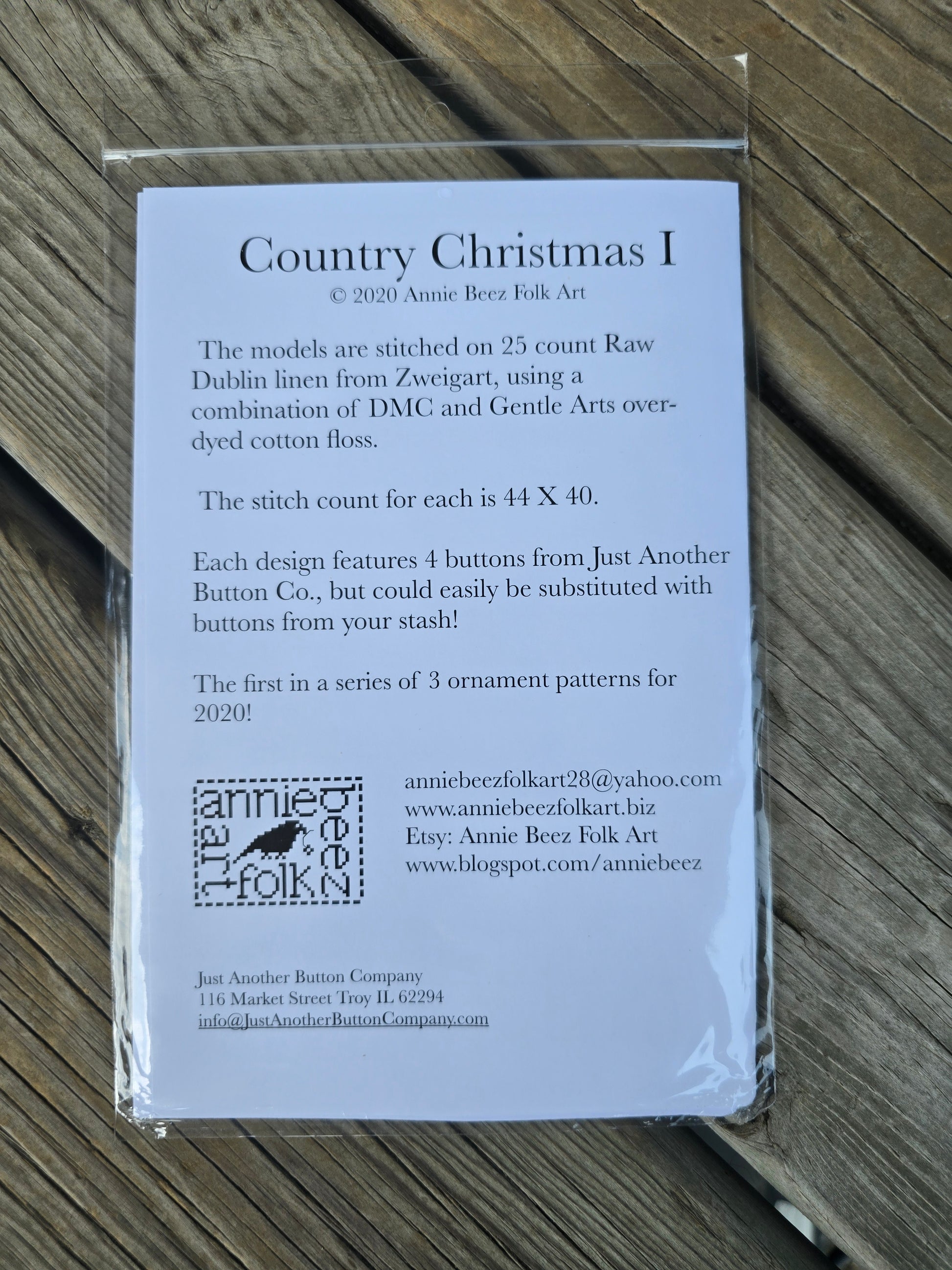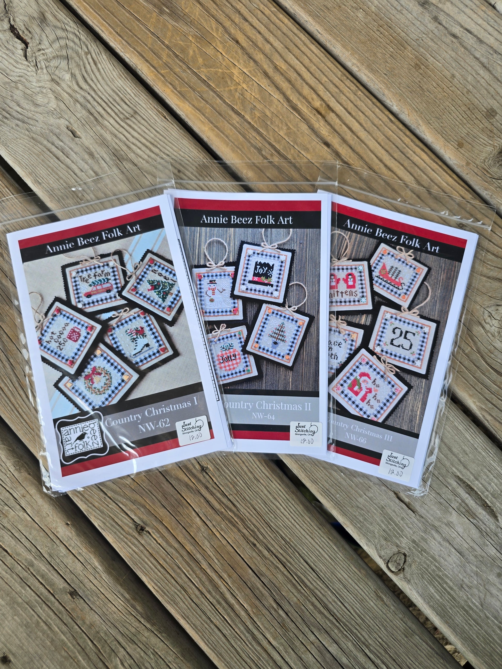 Country Christmas I, II, and III cross stitch patterns. Annie Beez Folk Art 2020. Stitch count I: 44 x 40. Stitch count II: 44 x 40. Stitch count III: 44 x 40. Estate find. Like new in package.
