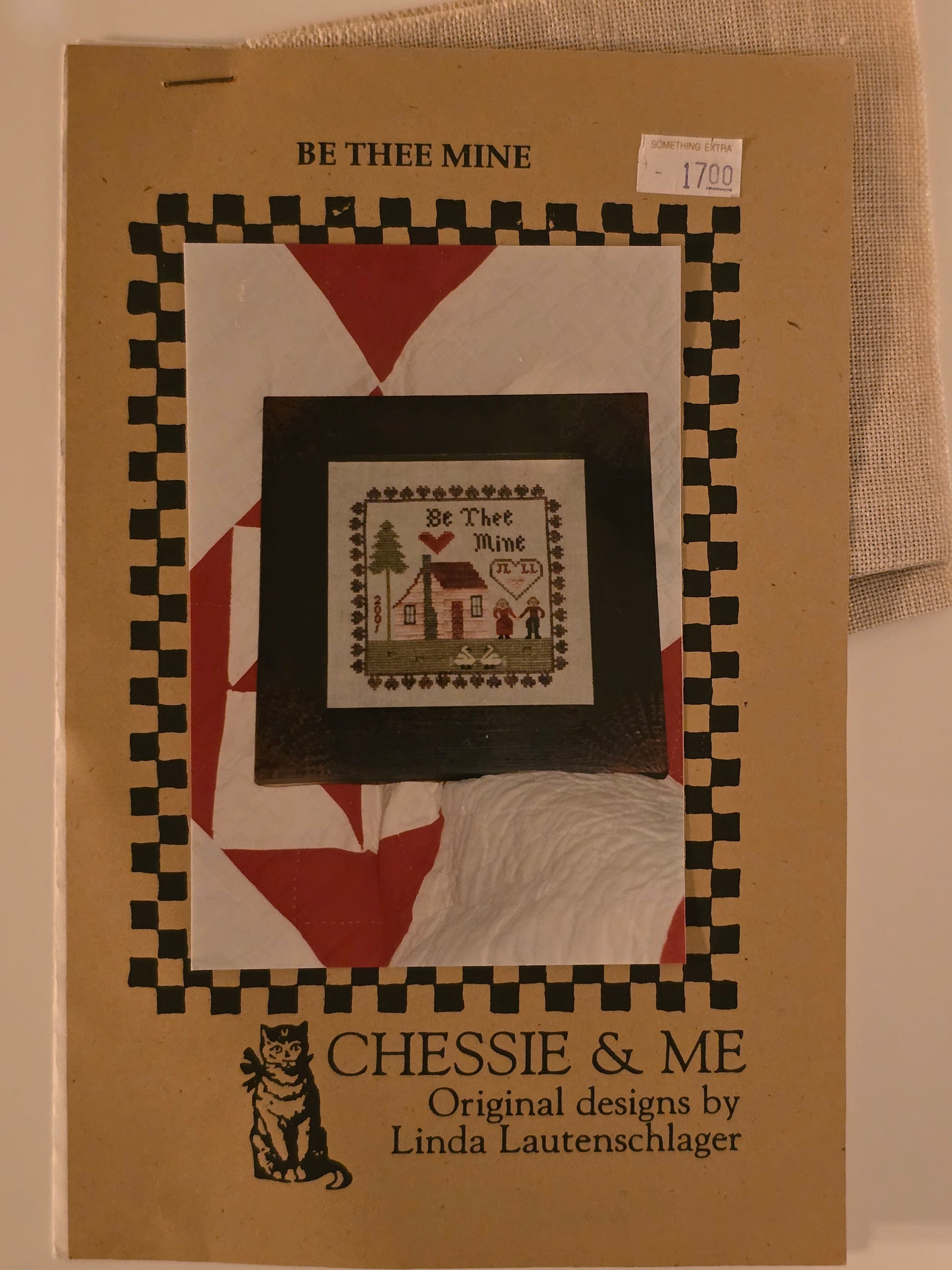 Be Thee Mine cross stitch sampler pattern and linen. Chessie & Me. Stitch count: 77W x 77H. Design area: 5" x 5". Estate find. Linen stapled to pattern. No plastic package for pattern. Good condition.