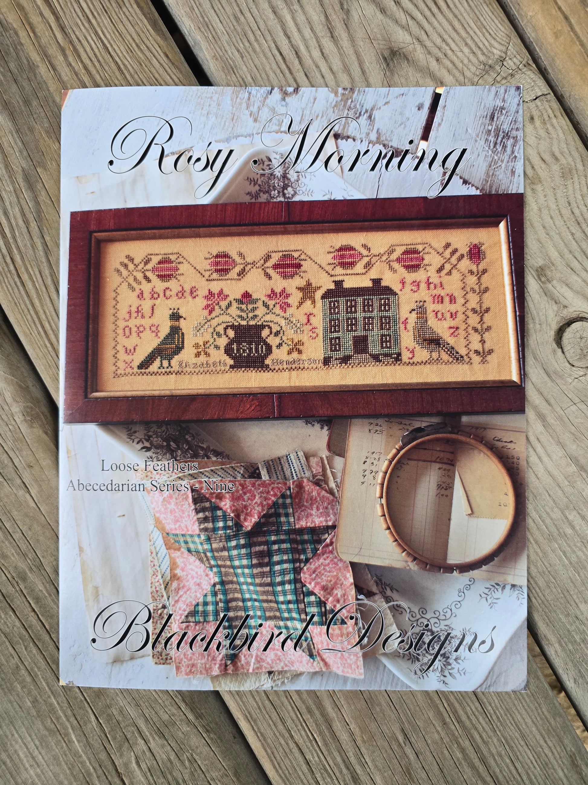 Rosy Morning cross stitch pattern booklet. Blackbird Designs 2014. OOP. Design size: 171w x 60h. Estate find. Like new. Appears unused.