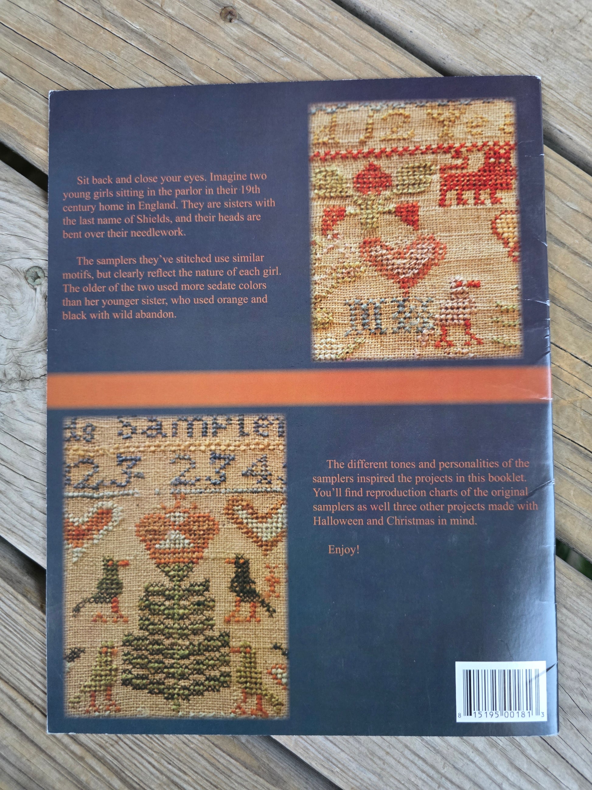 Sisters cross stitch pattern book. Blackbird Designs 2013. Contains five separate samplers. Stitch count: A Shields 1834 110 x 163, H Shields 1823 113 x 149, At First Cock's Crow 133 x 155, Peace and Plenty 139 x 193, Witch No More 173 x 94. Estate find. Like new.