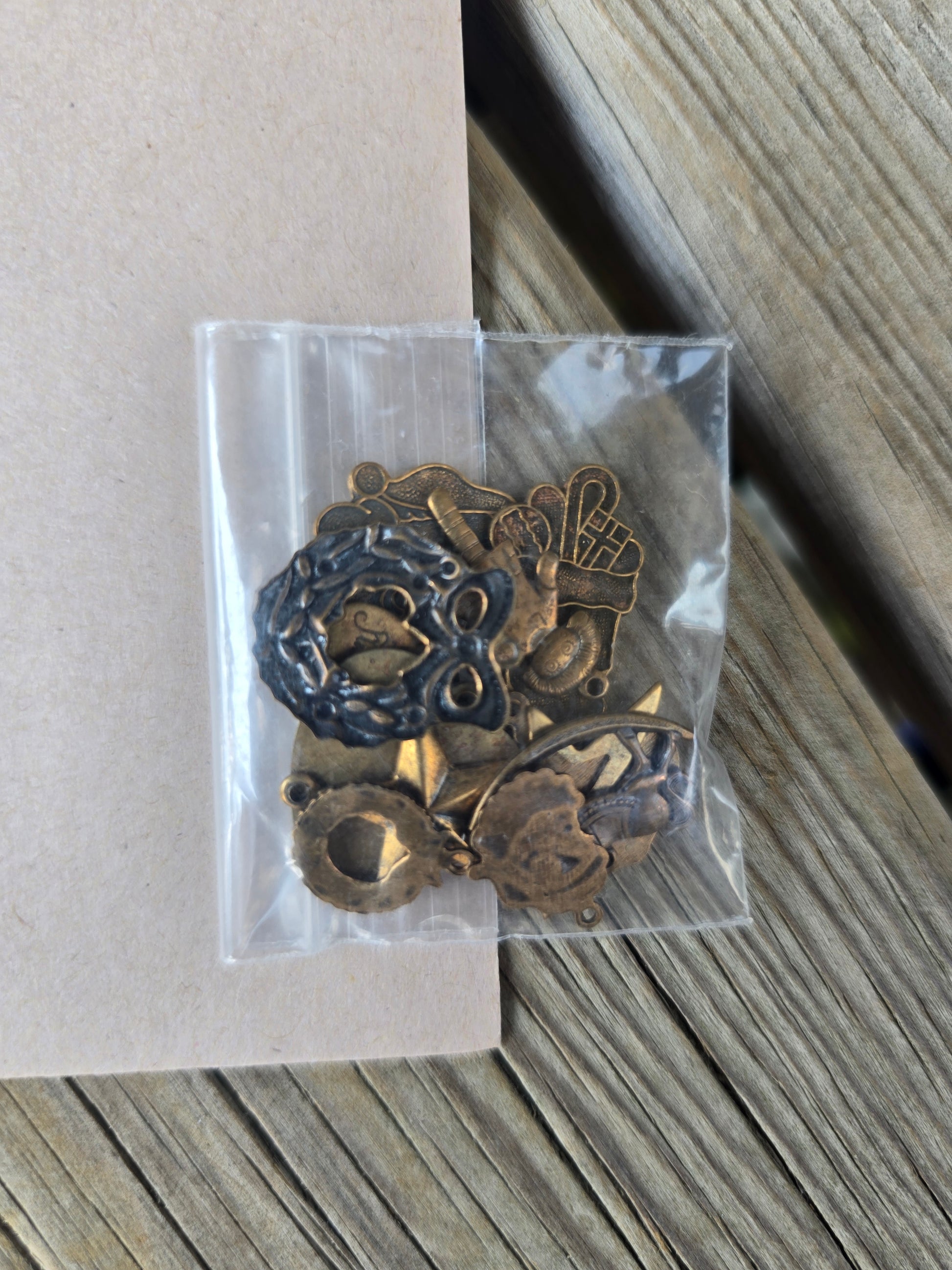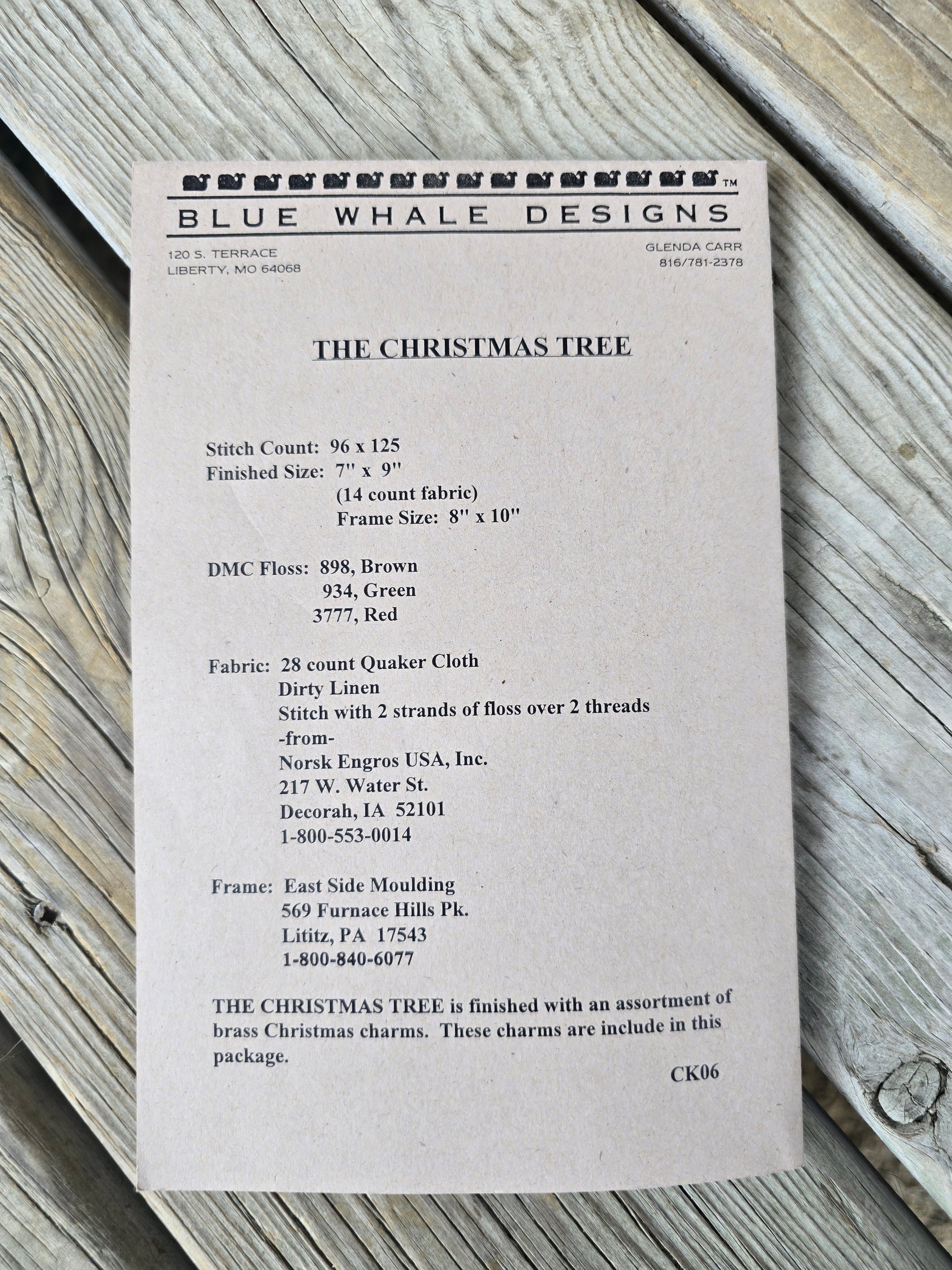 The Christmas tree cross stitch pattern with metal charms. Blue Whale Designs. Stitch count: 96 x 125. Charm package stapled to chart. Estate find. Good condition.