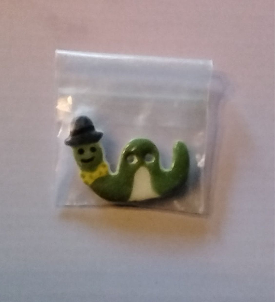 Ceramic bookworm button. Maker unknown. Size: 1 1/4". Estate find. Like new in package.