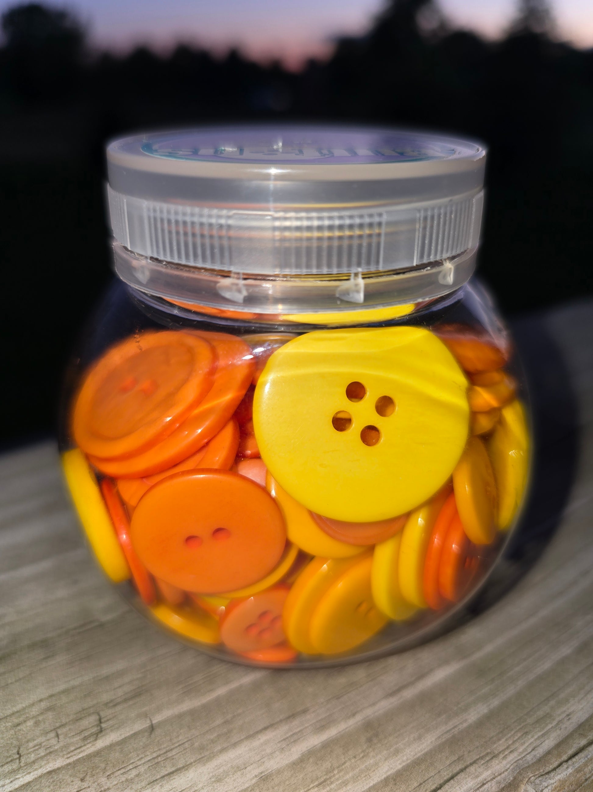 Four ounce jar of assorted color and size plastic buttons. Blumenthal Lansing. Choose from red, green, blue or marigold. New product.