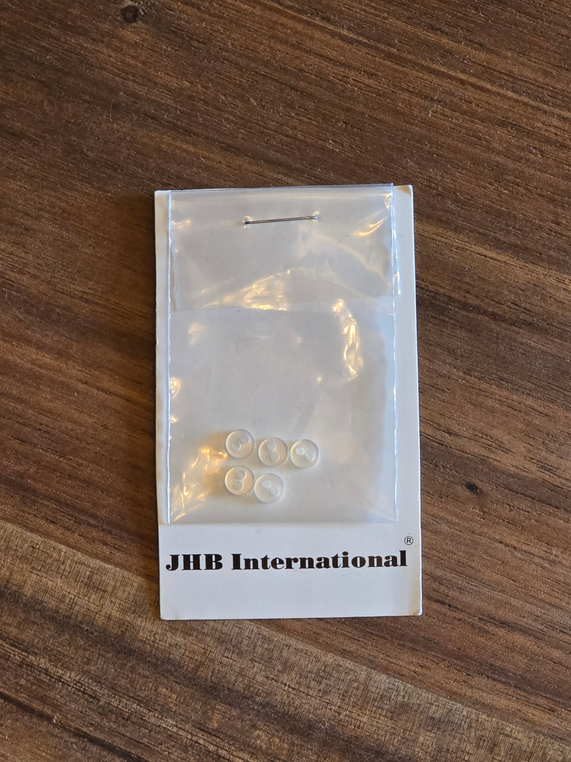 1/8" Round Plastic buttons. JHB International. Red, black or clear. Five buttons per package. Size: 1/8". Estate find. Good condition.