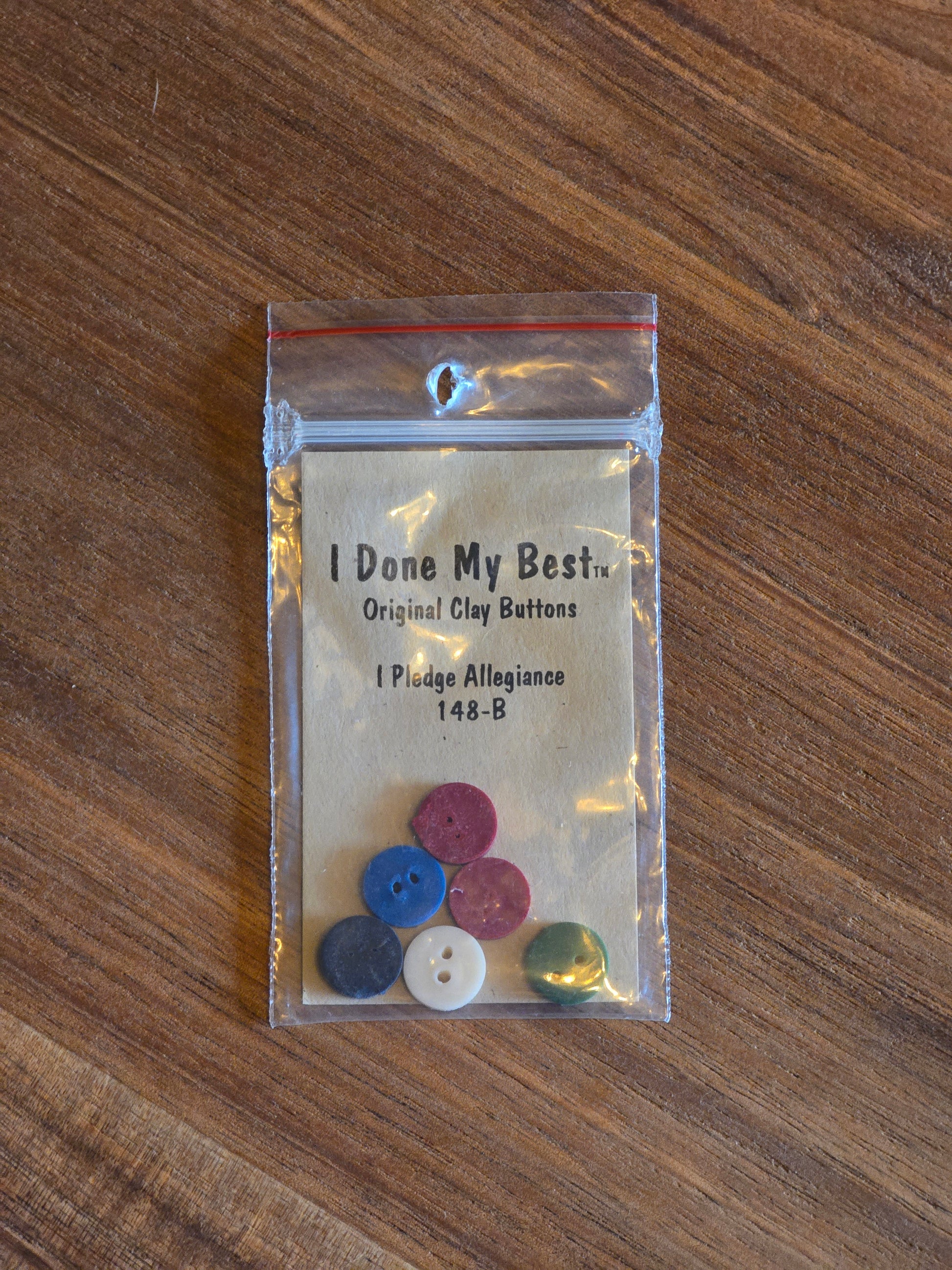 I Pledge Allegiance clay buttons. I Done My Best. Size: 3/8". Estate find. Like new.