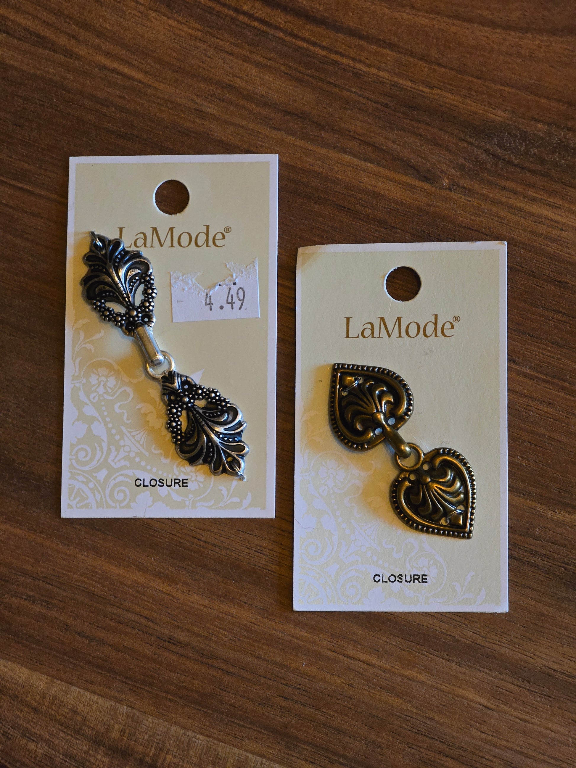 Your choice of silver or gold ornate metal closure. LaMode. Size: silver 2.5", gold 2". Made in China. New product.