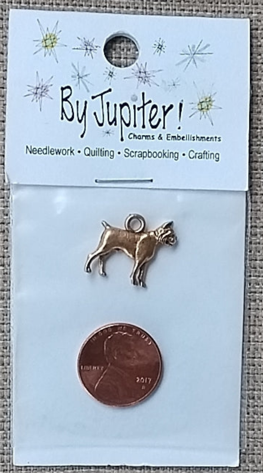 Antique gold finish, pewter-cast Boxer charm. By Jupiter. American made. New stock. Great for use in needlework, quilting, scrapbooking and crafting.