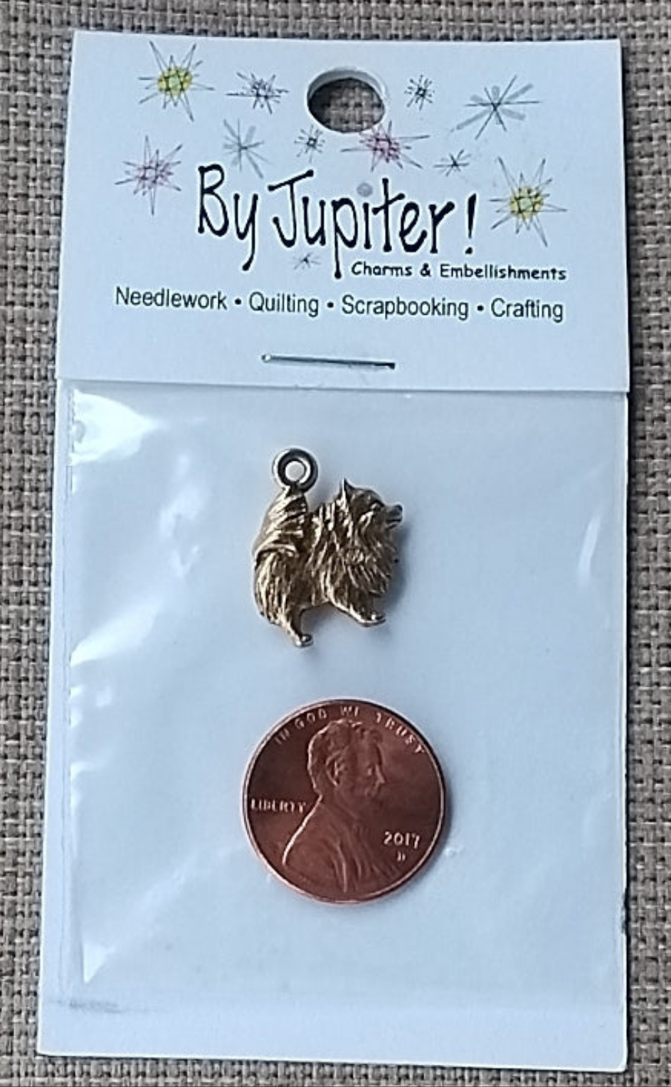 Antique gold finish, pewter-cast Pomeranian charm. By Jupiter. American made. New stock. Great for use in needlework, quilting, scrapbooking and crafting.