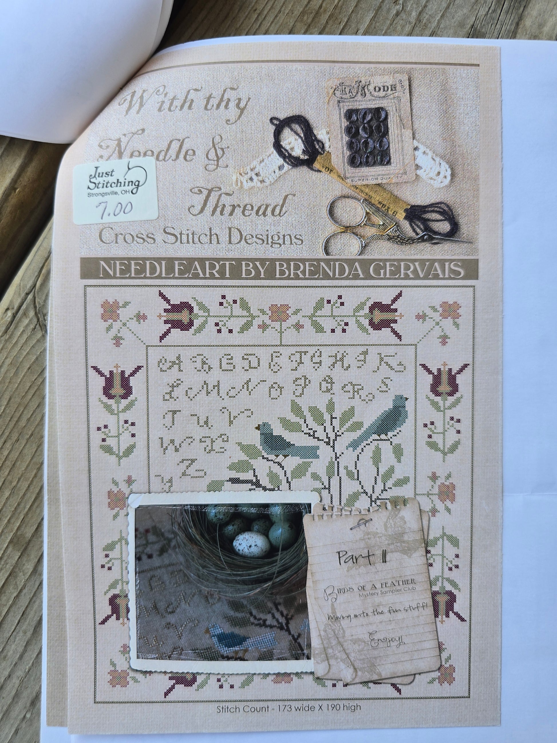 Birds of a Feather Mystery Sampler cross stitch pattern. With Thy Needle & Thread 2011. Stitch count: 173w x 190h. Mystery Sampler parts one, two and three. Three pattern covers and patterns stapled together. Estate find. Used condition.