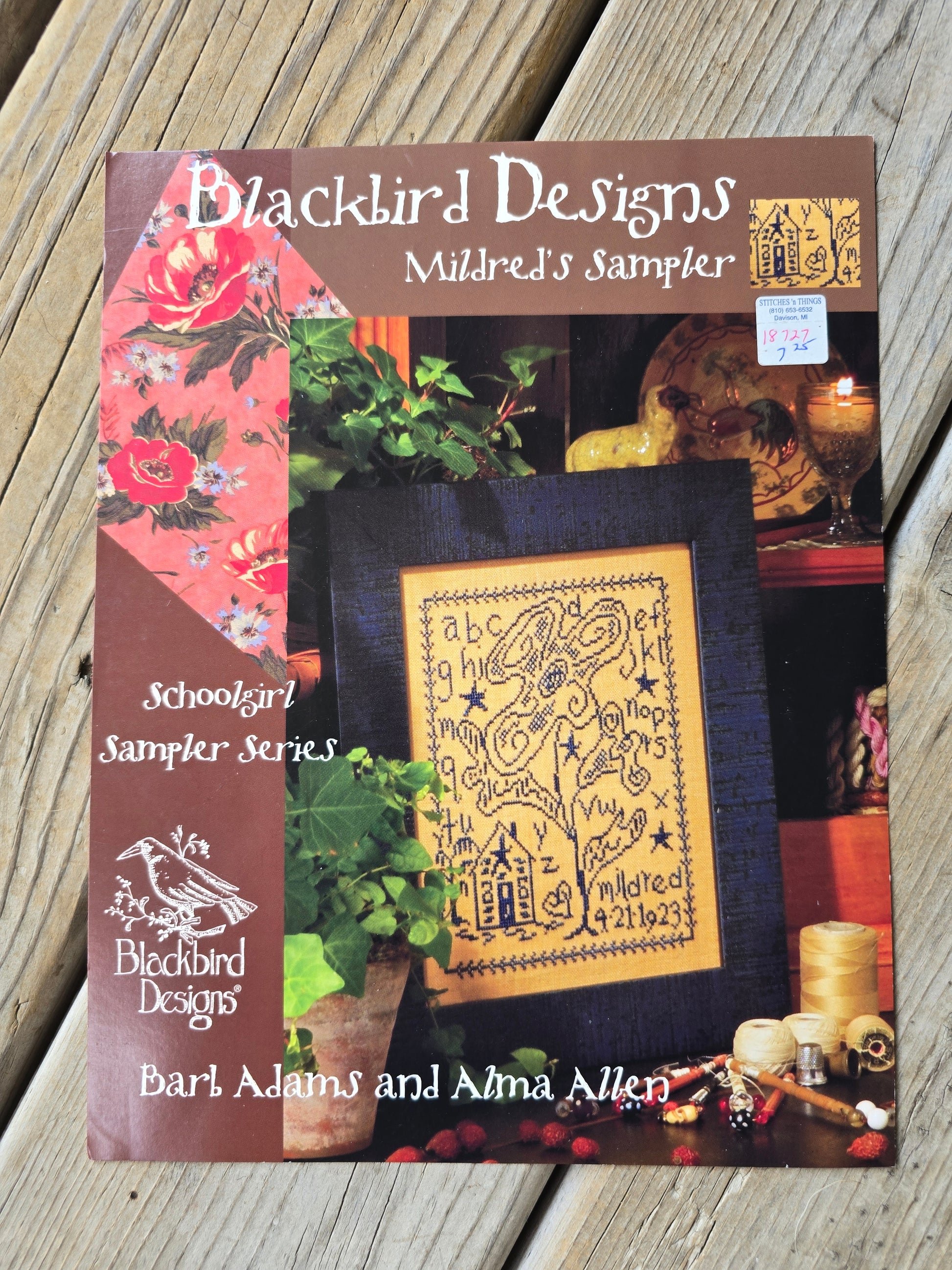 Mildred's Sampler cross stitch pattern leaflet. Blackbird Designs 2003. OOP. Design size: 102w x 120h. Estate find. Like new. Appears unused.