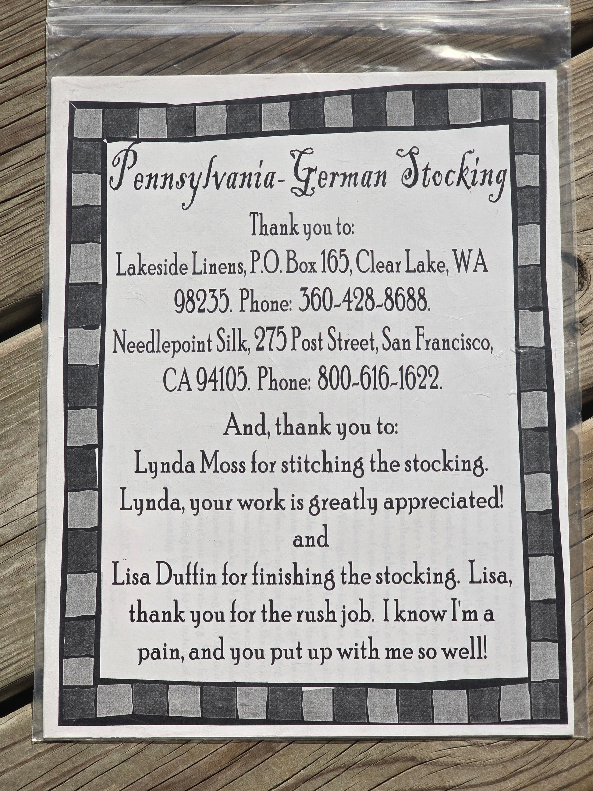 Pennsylvania-German Stocking cross stitch pattern. Carriage House Samplings 2004. Stitch count: 172w x 417h. Estate find. Good condition. In original package.