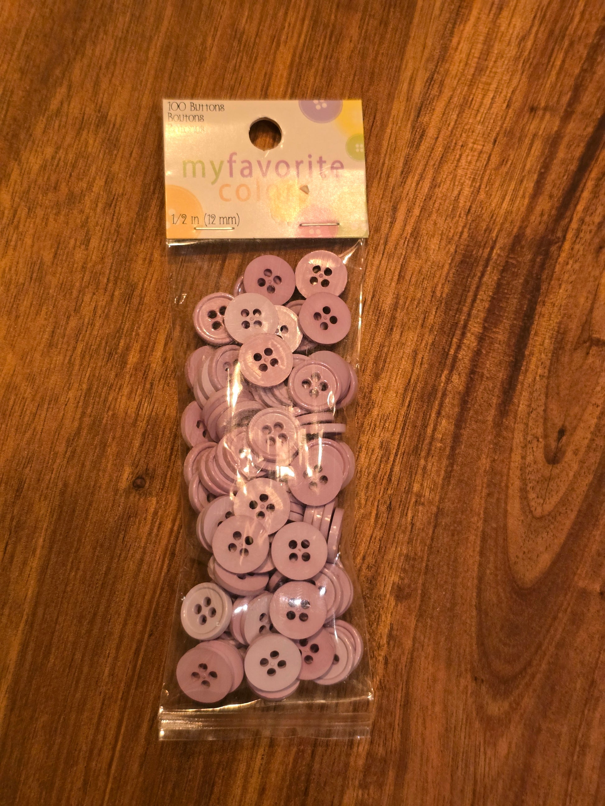 Package of 100 round plastic buttons (1/2", 12mm). My Favorite Colors. Yellow or purple. New product.