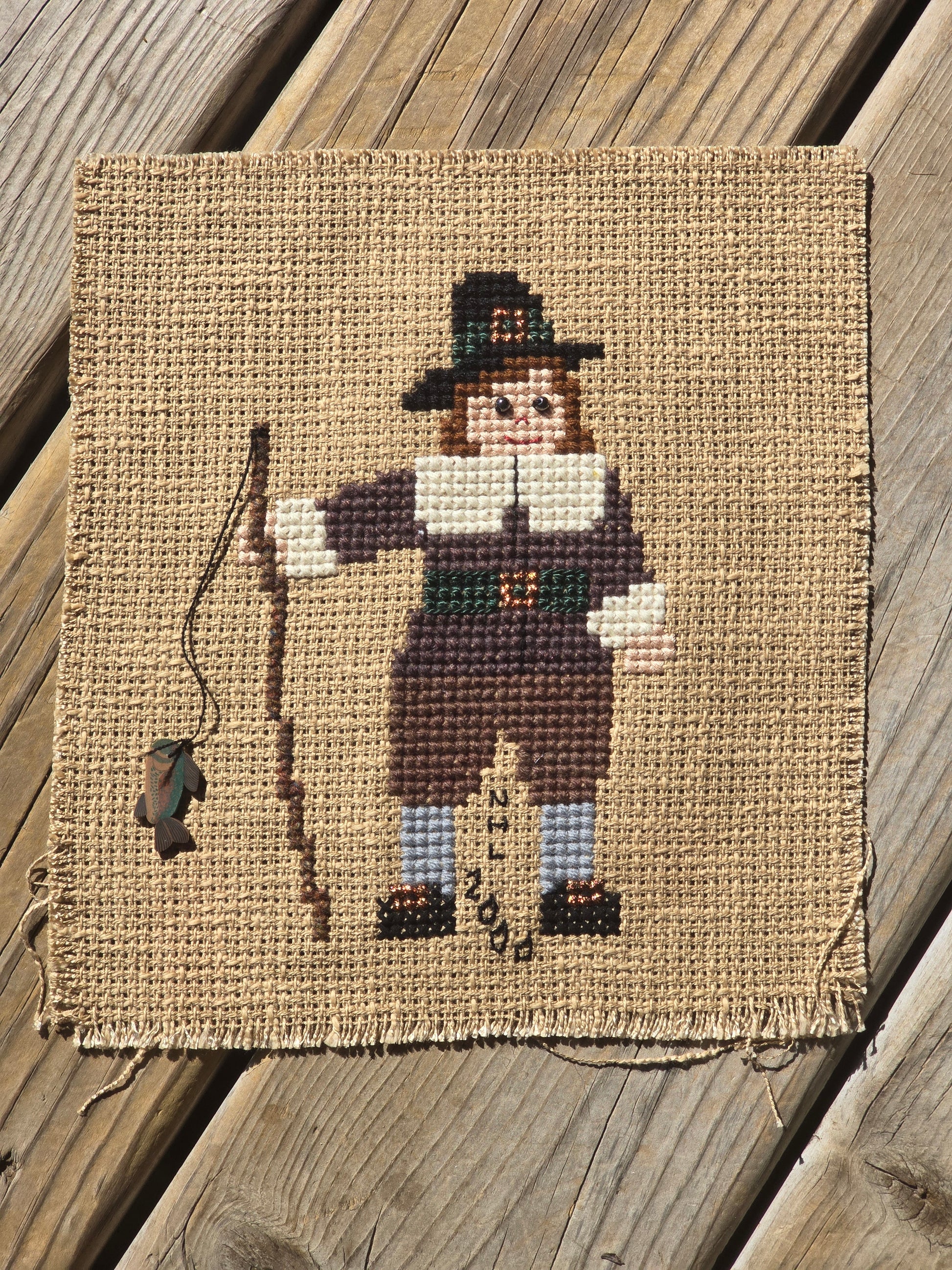 Fishing Pilgrim completed cross stitch with polymer clay fish button. Cloth size: 9" x 10". Stitched area: 5" x 7.5". Estate find. Good condition. Colors may vary from photo, based on lighting. Finish as desired.