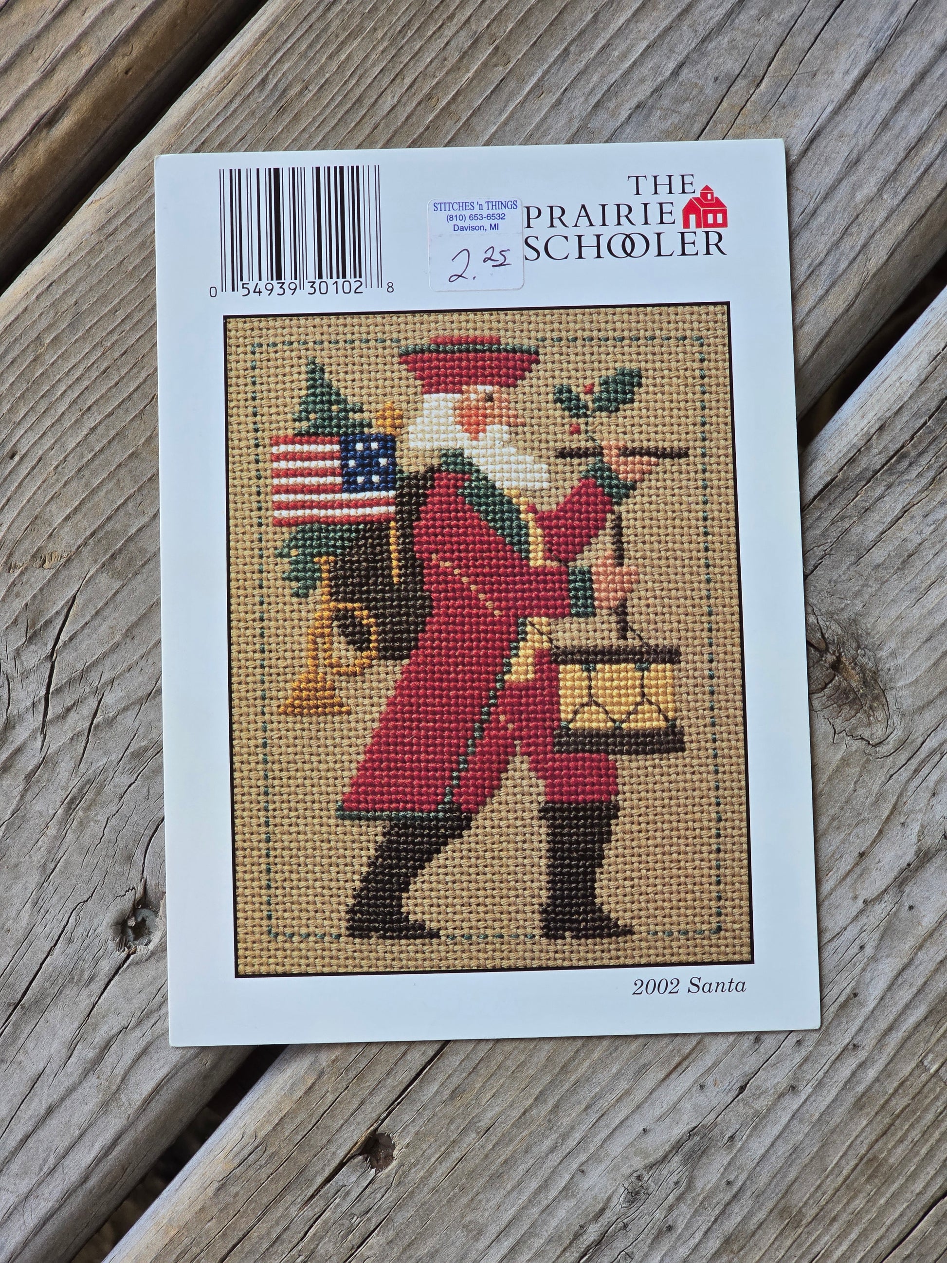 2002 Santa cross stitch pattern. The Prairie Schooler 2002. Stitch count: 75h x 58w. Estate find. Good condition. Wear on corners.