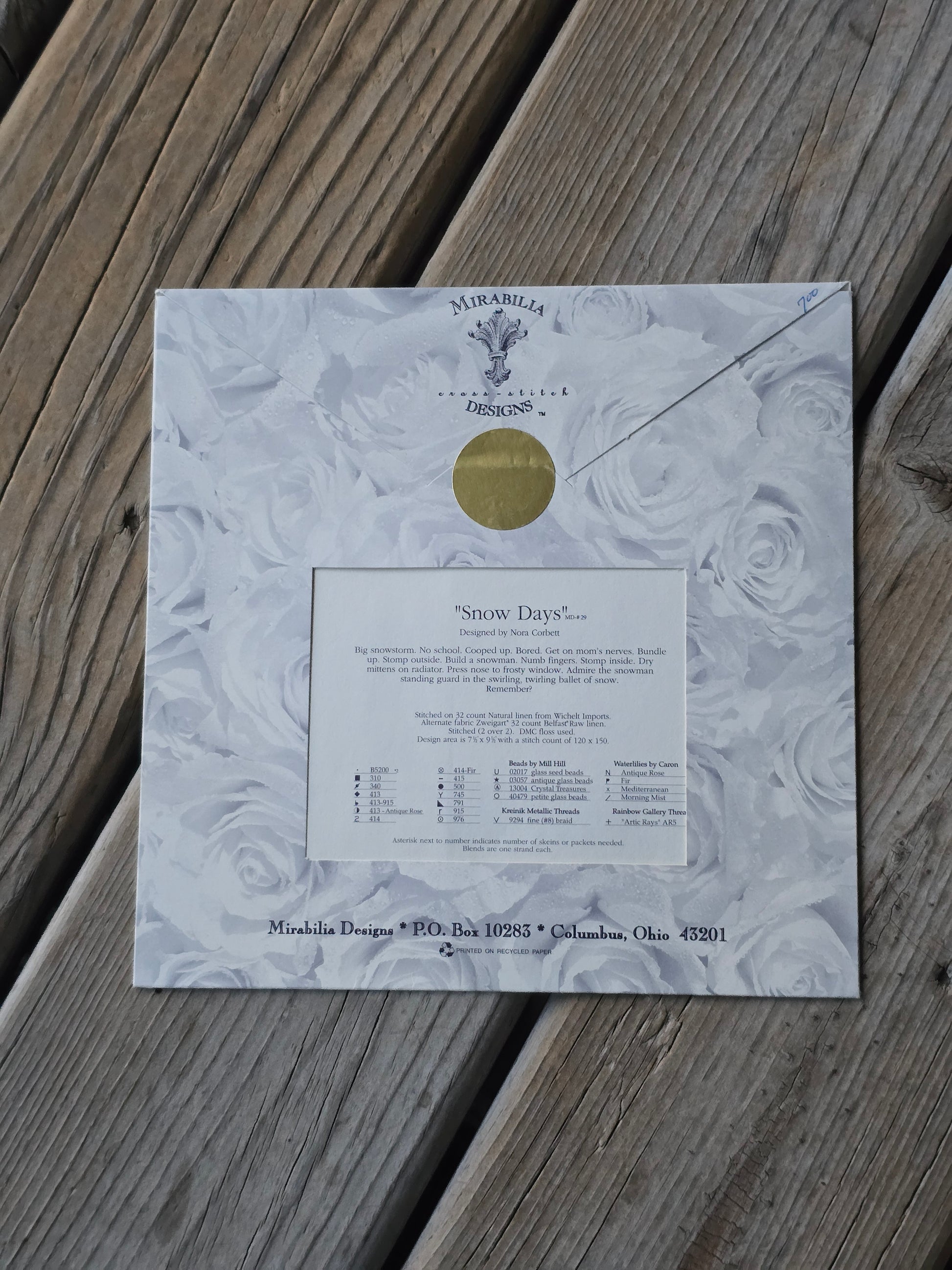 Snow Days cross stitch pattern. Mirabilia Designs 1997. Stitch count: 120 x 150. Estate find. Like new. Unopened pattern. Original price written in ink on upper right corner of back cover.