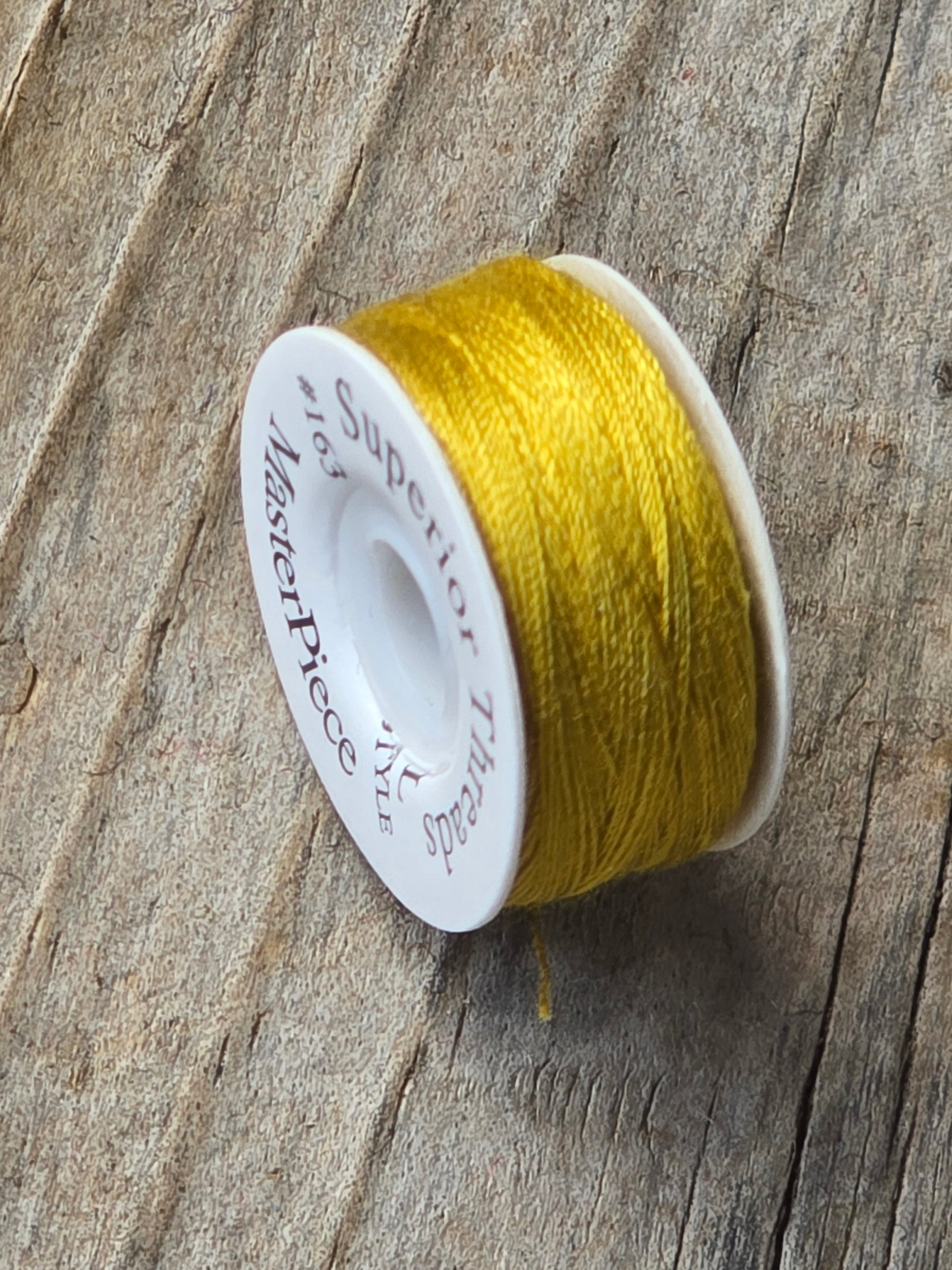 Master Piece Replacement Bobbins - #163. Superior Threads. #50/2-ply extra-long staple Egyptian-grown cotton. Approximately 80 yards each. Designed for quilting, sewing, applique and embroidery. Known for creating precise stitches, strength and low lint. Great to refill your Superior Threads Donut. New, old stock. Price is for one bobbin. Color may vary from photo.