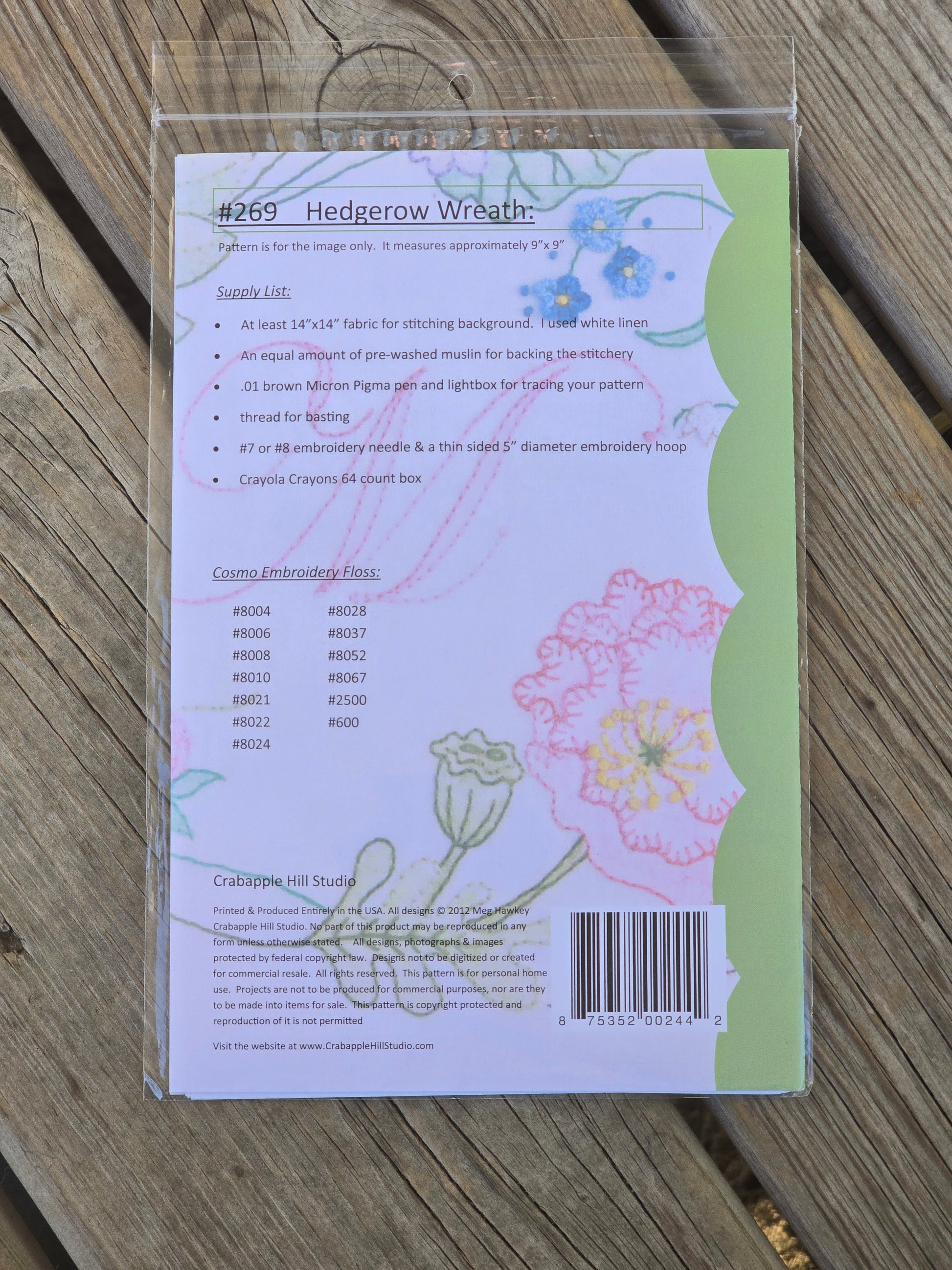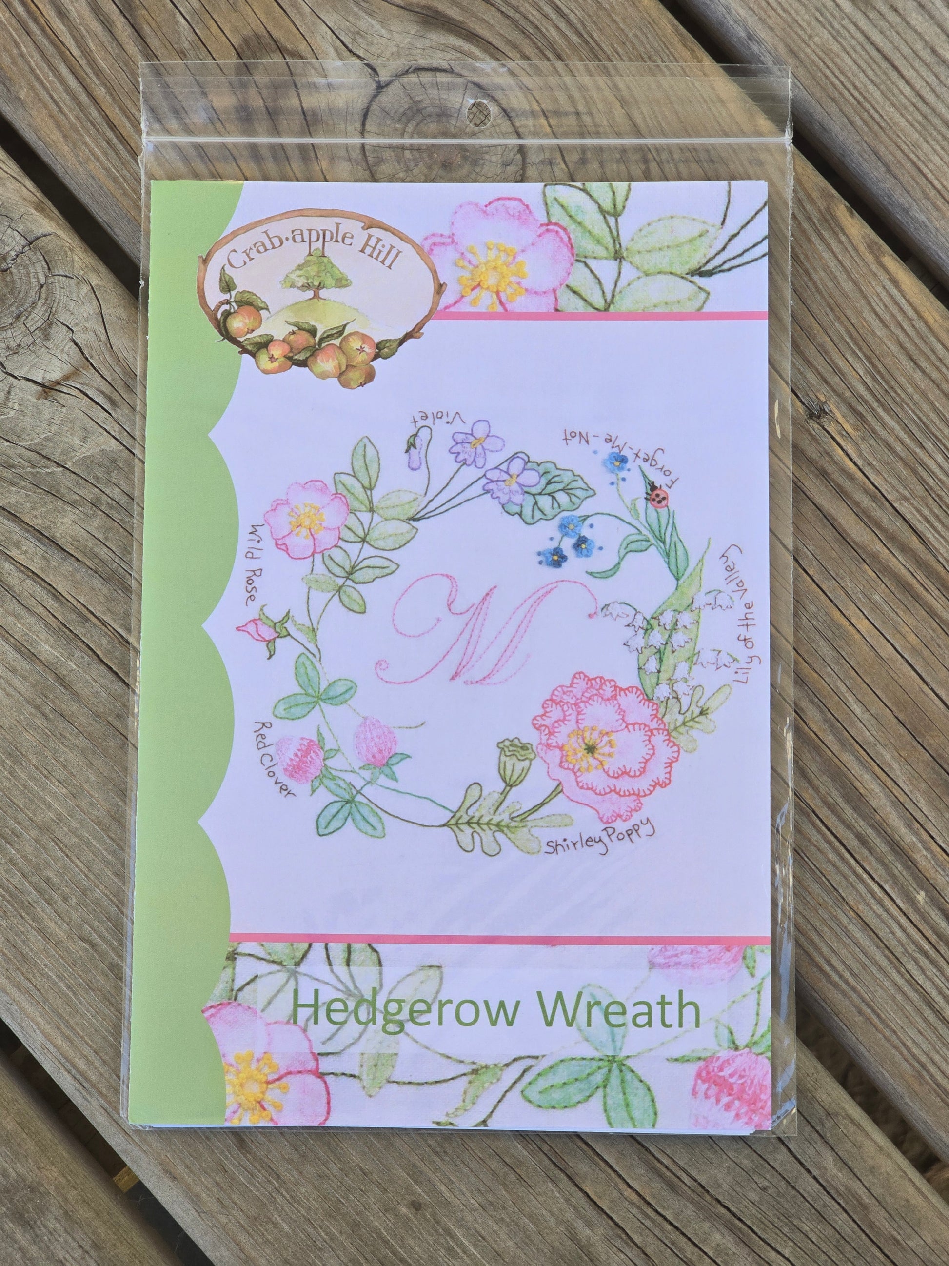 Hedgerow Wreath embroidery pattern. Crab-apple Hill 2012. Image measures approximately 9" x 9". From a retired quilt shop. New in original package.