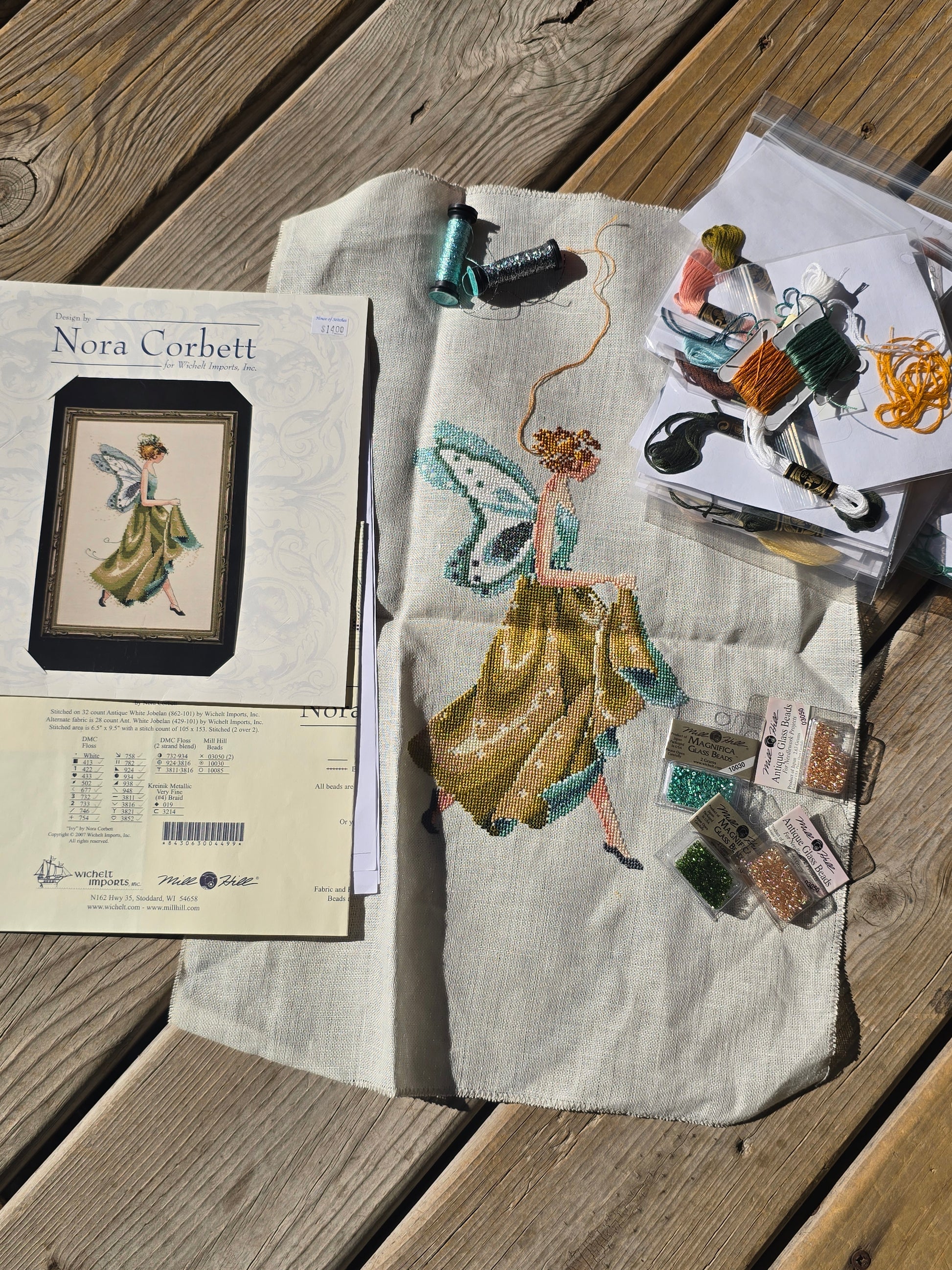 Ivy cross stitch kit. Mirabilia Designs 2007. Stitch count: 105 x 153. Estate find. Used condition. Kit includes chart, partially started cloth, 4 unopened bead packs, 2 partially used Kreinik Metallics and 25 skeins of partially used floss.
