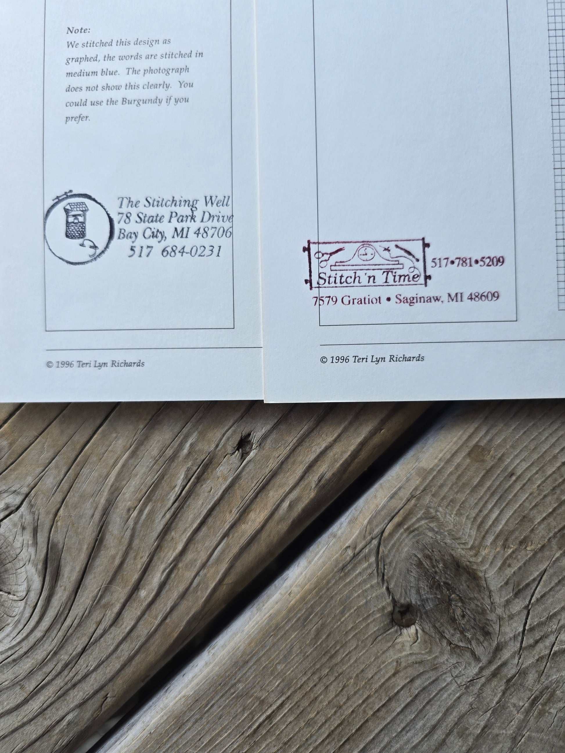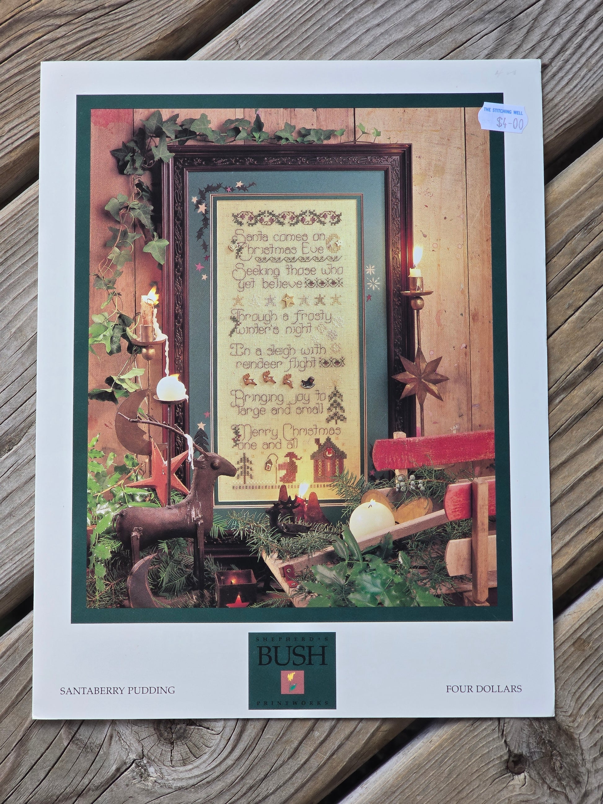 Santaberry Pudding cross stitch pattern. Shepherd's Bush 1996. Stitch count: 72w x 170h. Estate find. Good condition. Bottom corners have slight bends. Two copies available, both copies have store stamp on inside cover. Neither copy includes buttons.