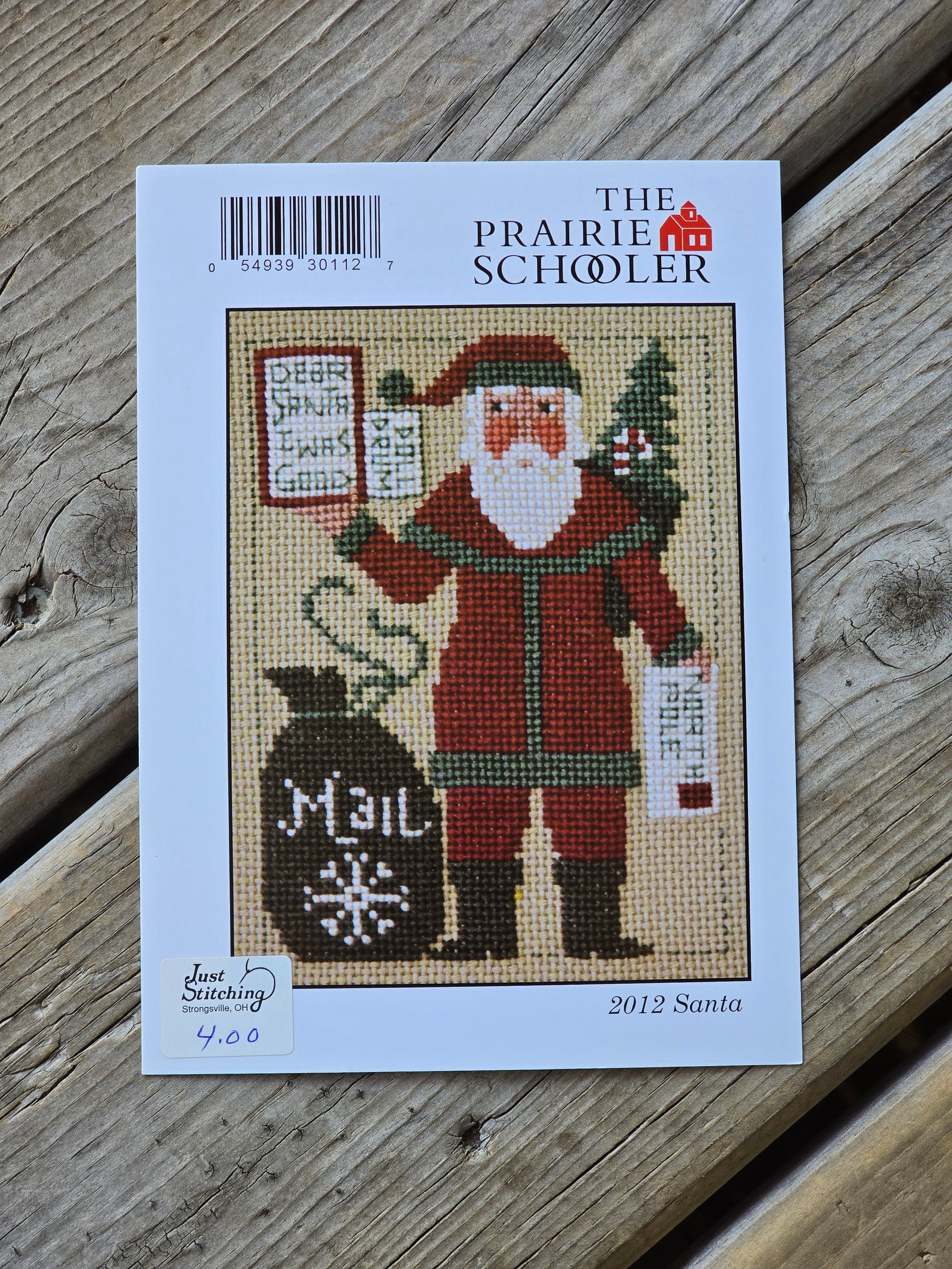2012 Santa cross stitch pattern. The Prairie Schooler 2012. Stitch count: 75h x 57w. Estate find. Good condition.