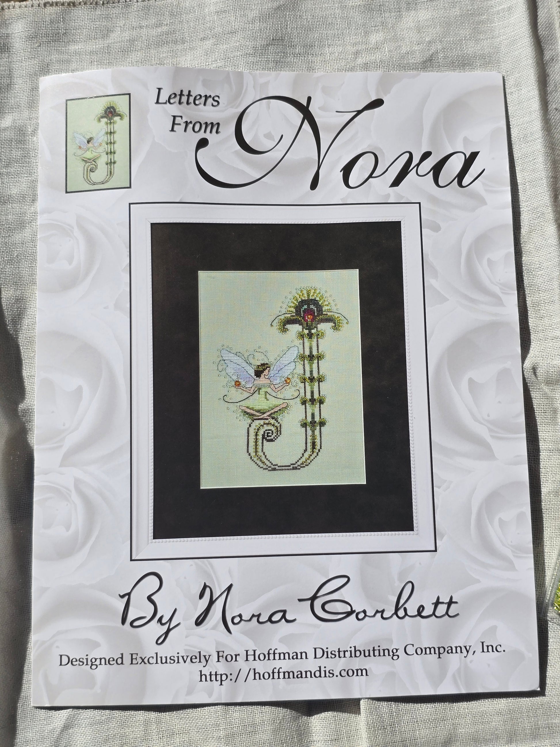 Letters From Nora "Letter J" cross stitch kit. Mirabilia Designs 2009. Stitch count: 87 x 116. Estate find. Used condition. Kit includes chart, partially started cloth, 2 unopened bead packs, 1 unopened Crystal Treasures pack and 11 skeins of partially used floss.
