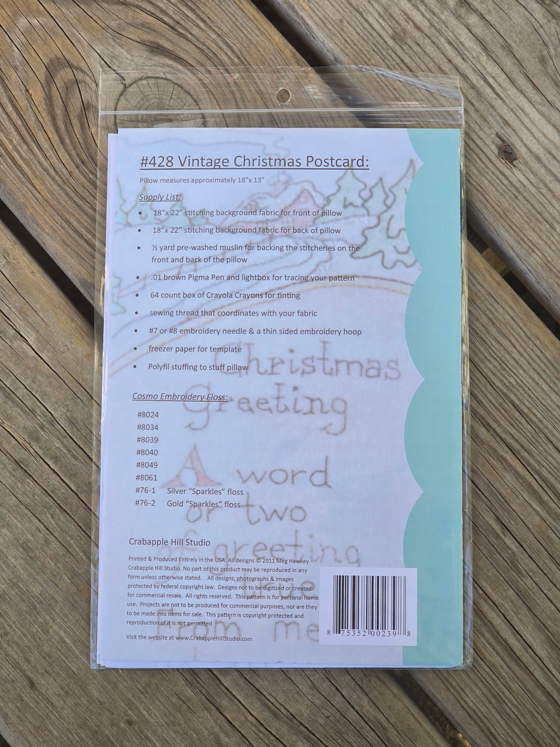 Vintage Christmas Postcard embroidery pattern. Crab-apple Hill 2011. Pillow measures approximately 18" x 13". From a retired quilt shop. New in original package.