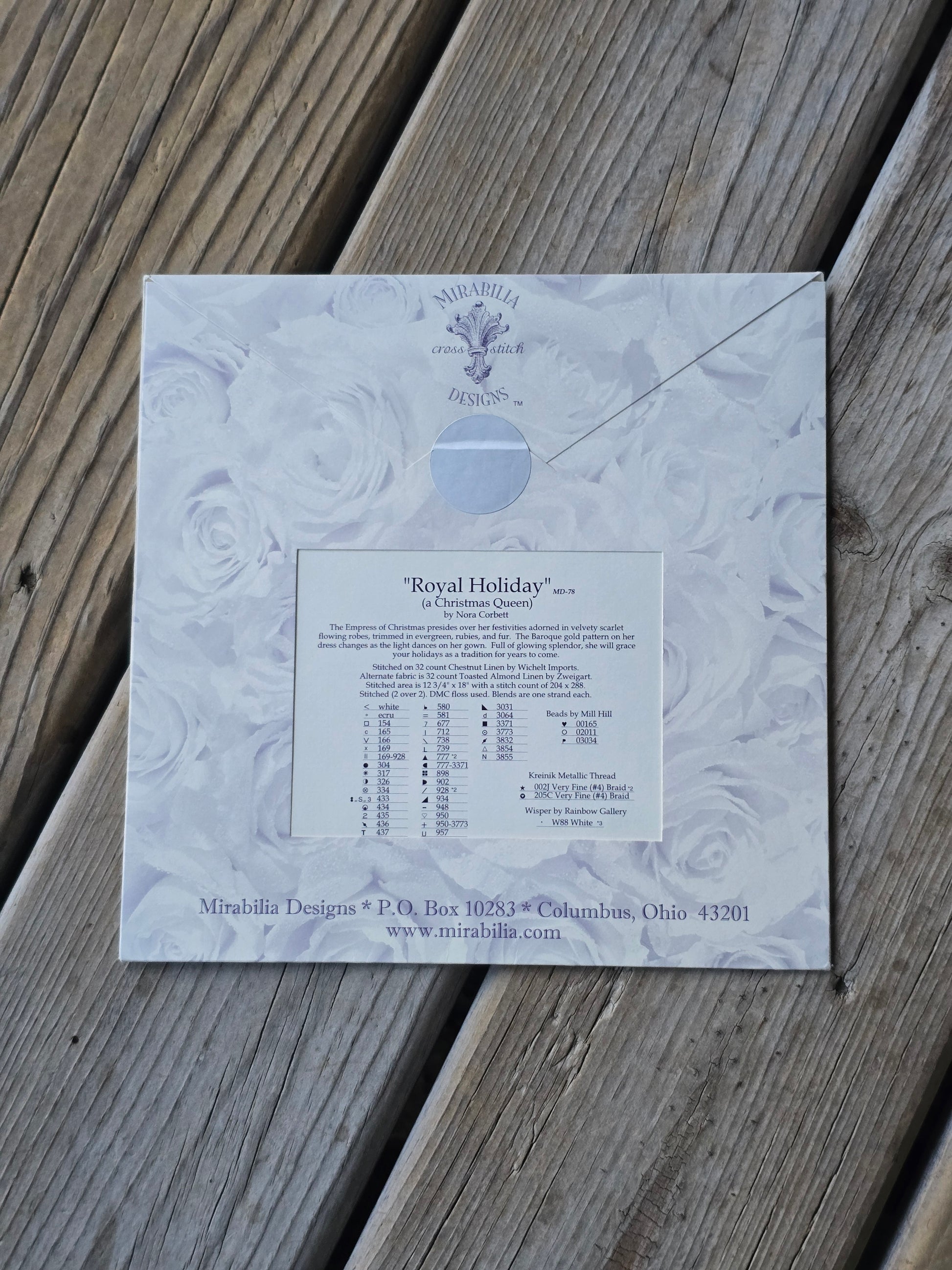 Royal Holiday cross stitch pattern. Mirabilia Designs 2004. Stitch count: 204 x 288. Estate find. Like new. Unopened pattern.