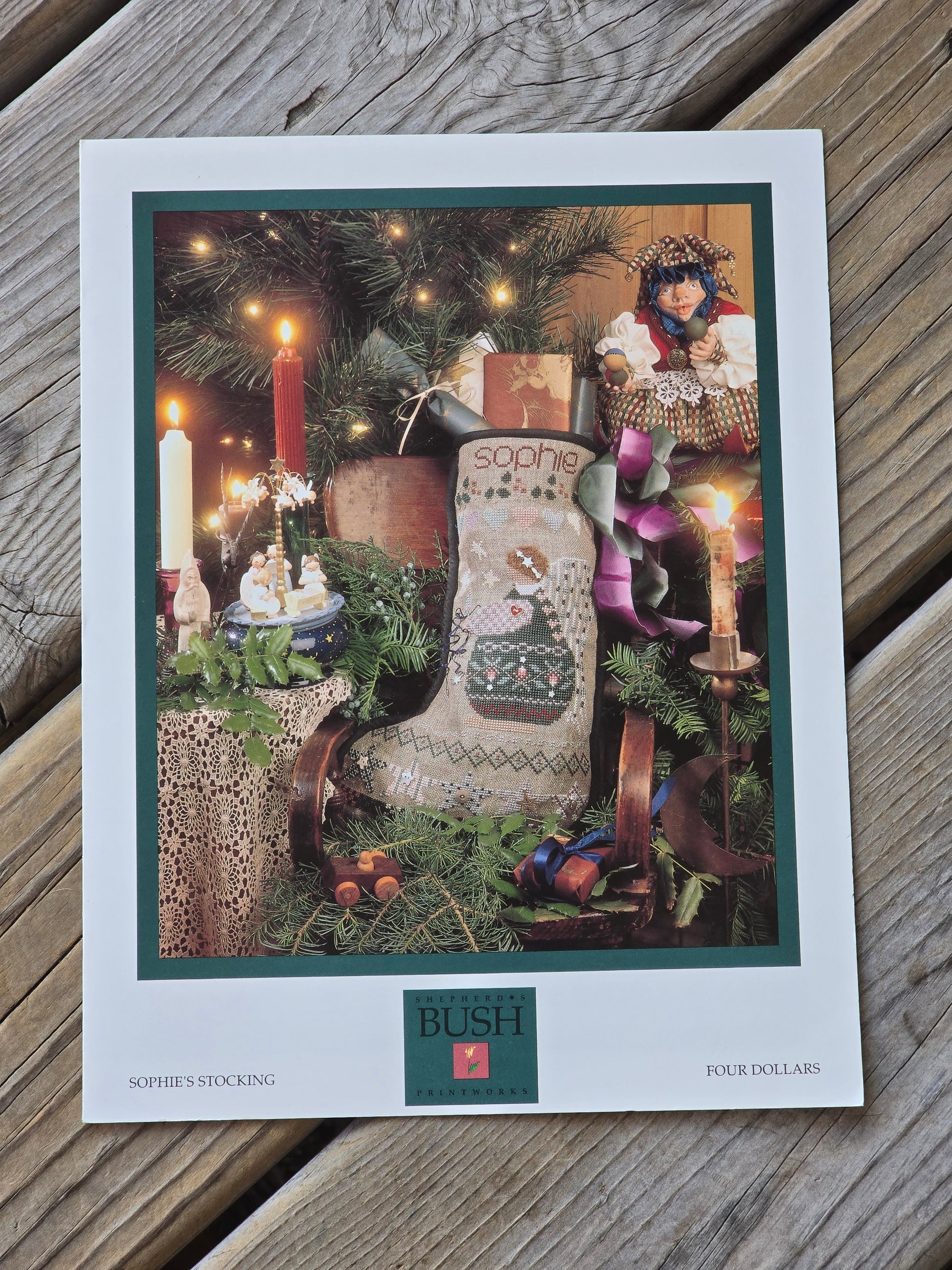 Sophie's Stocking cross stitch pattern. Shepherd's Bush 1995. Stitch count: 109 x 161. Estate find. Good condition. Store stamp on inside cover.
