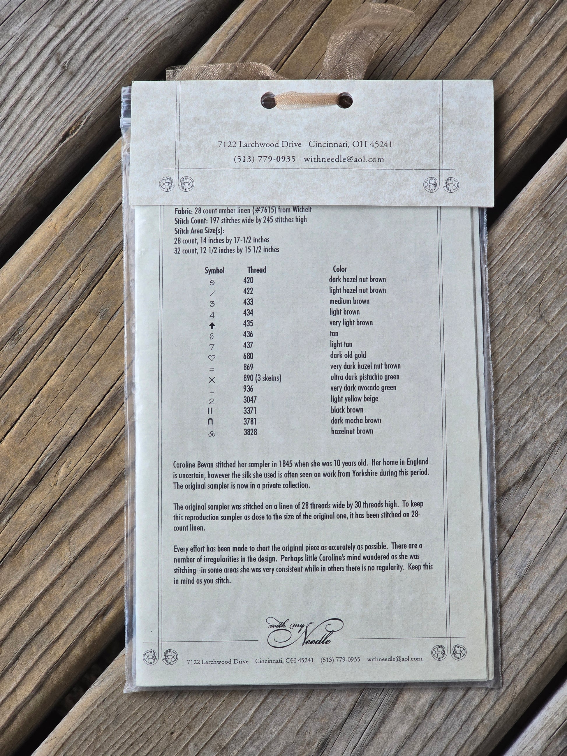 Caroline Bevan, 1845 cross stitch pattern. With My Needle. Stitch count: 197w x245h. Estate find. Like new in original package.
