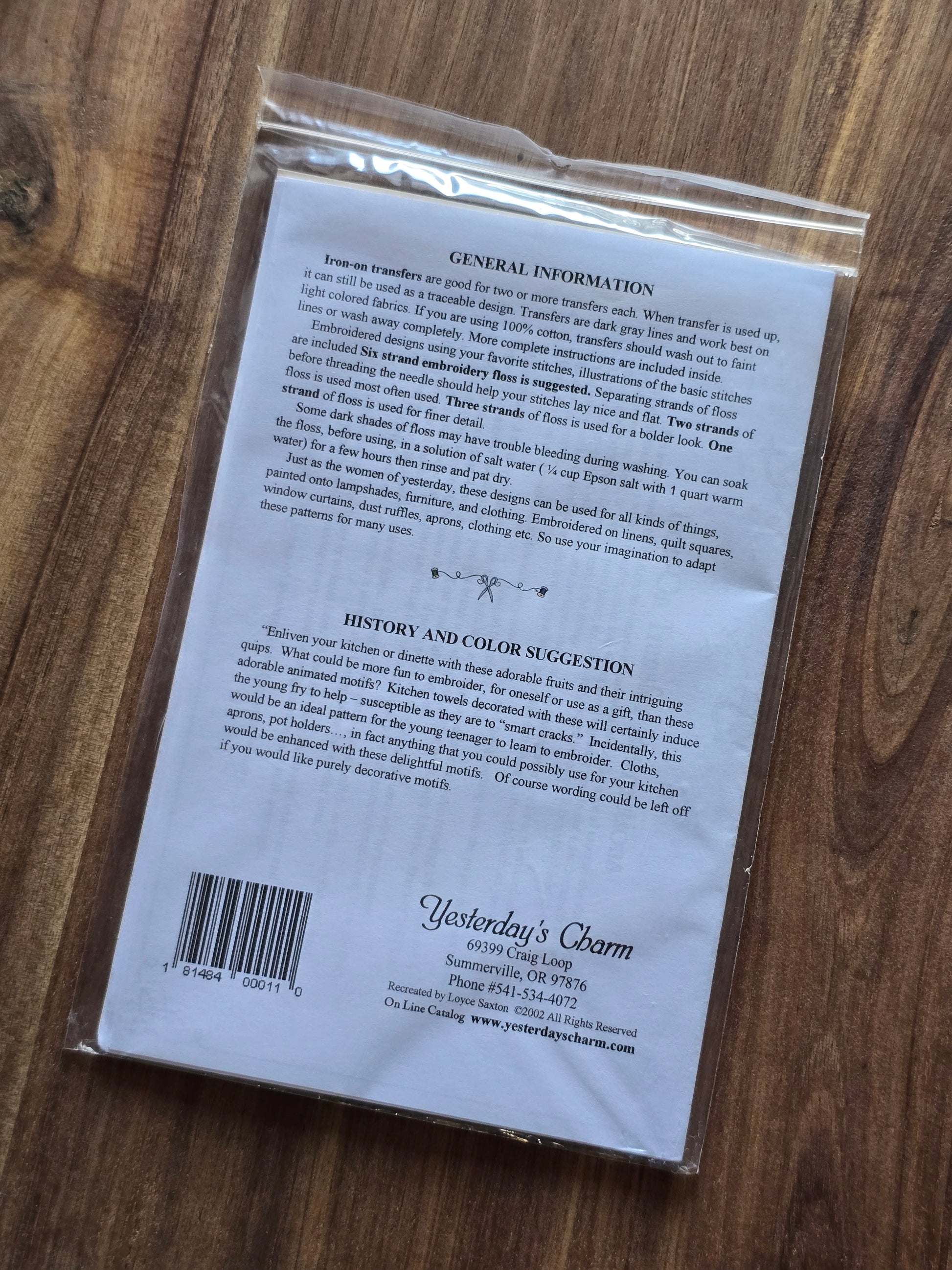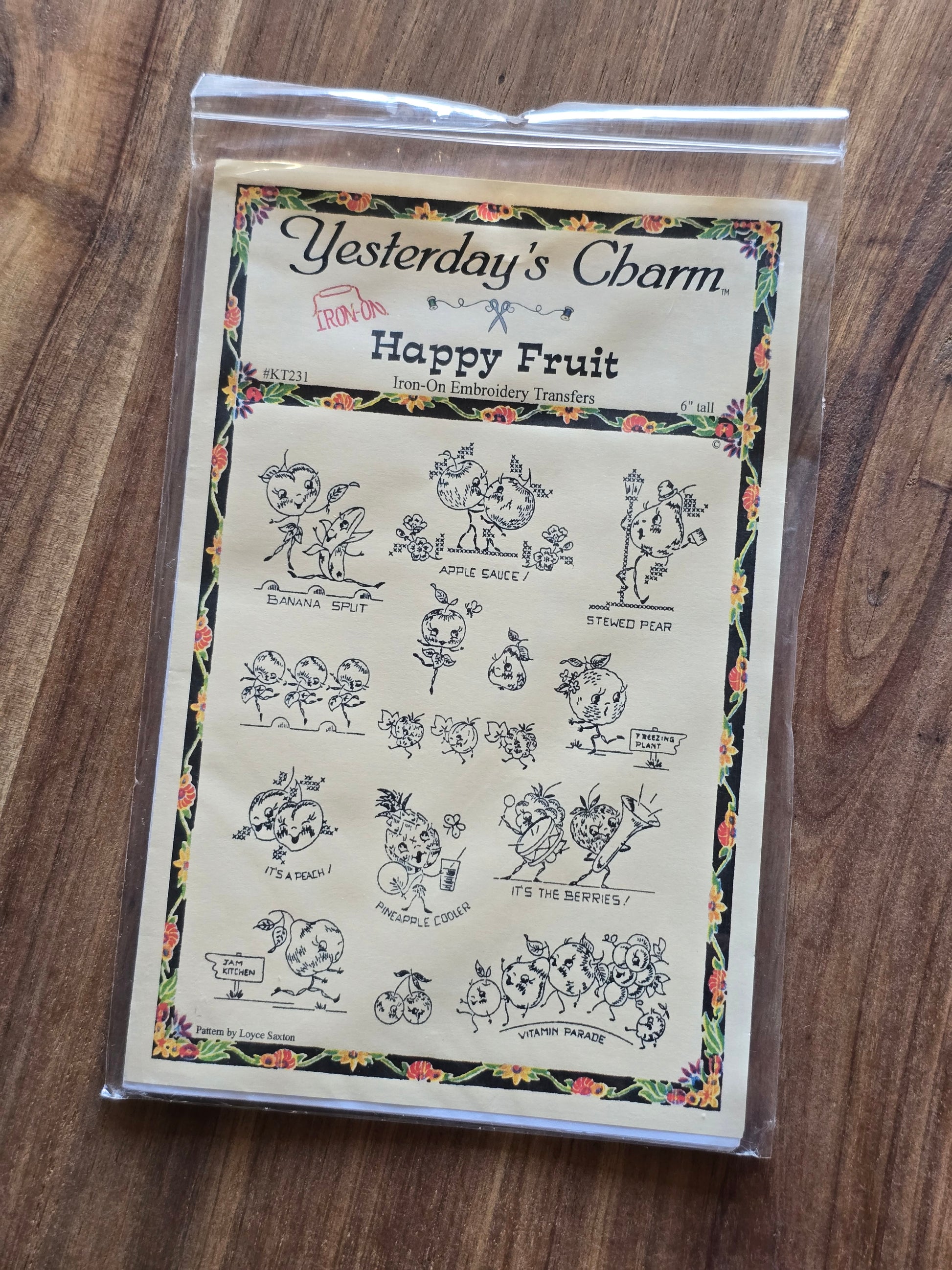 Happy Fruit embroidery pattern. Yesterday's Charm 2002. Design size 6" tall. Includes iron-on embroidery designs. From a retired quilt shop. New in original package.