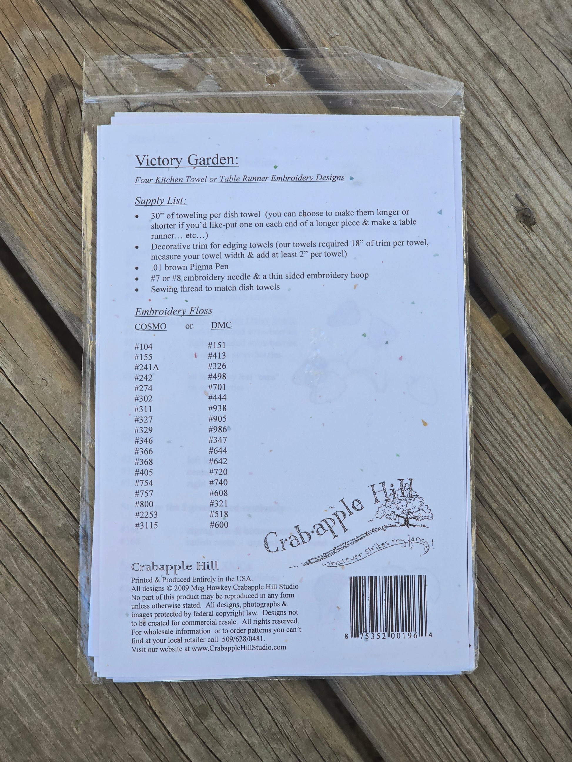 Victory Garden embroidery pattern. Crab-apple Hill 2009. Four kitchen towel or table runner embroidery designs. From a retired quilt shop. New in original package.