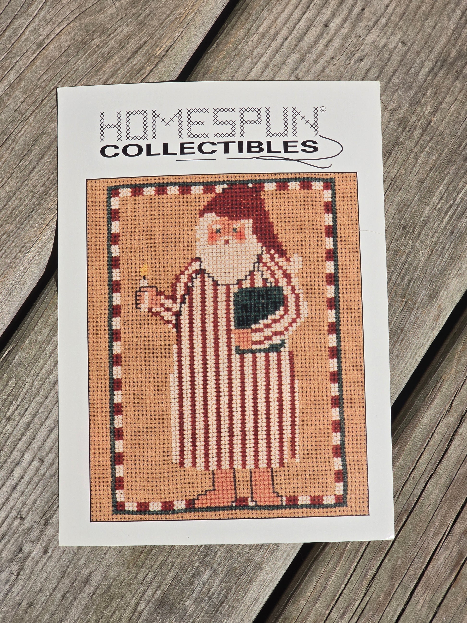 Santa in Nighshirt cross stitch pattern. Homespun Collectibles. Stitch count: 57w x 81h. Estate find. Good condition.