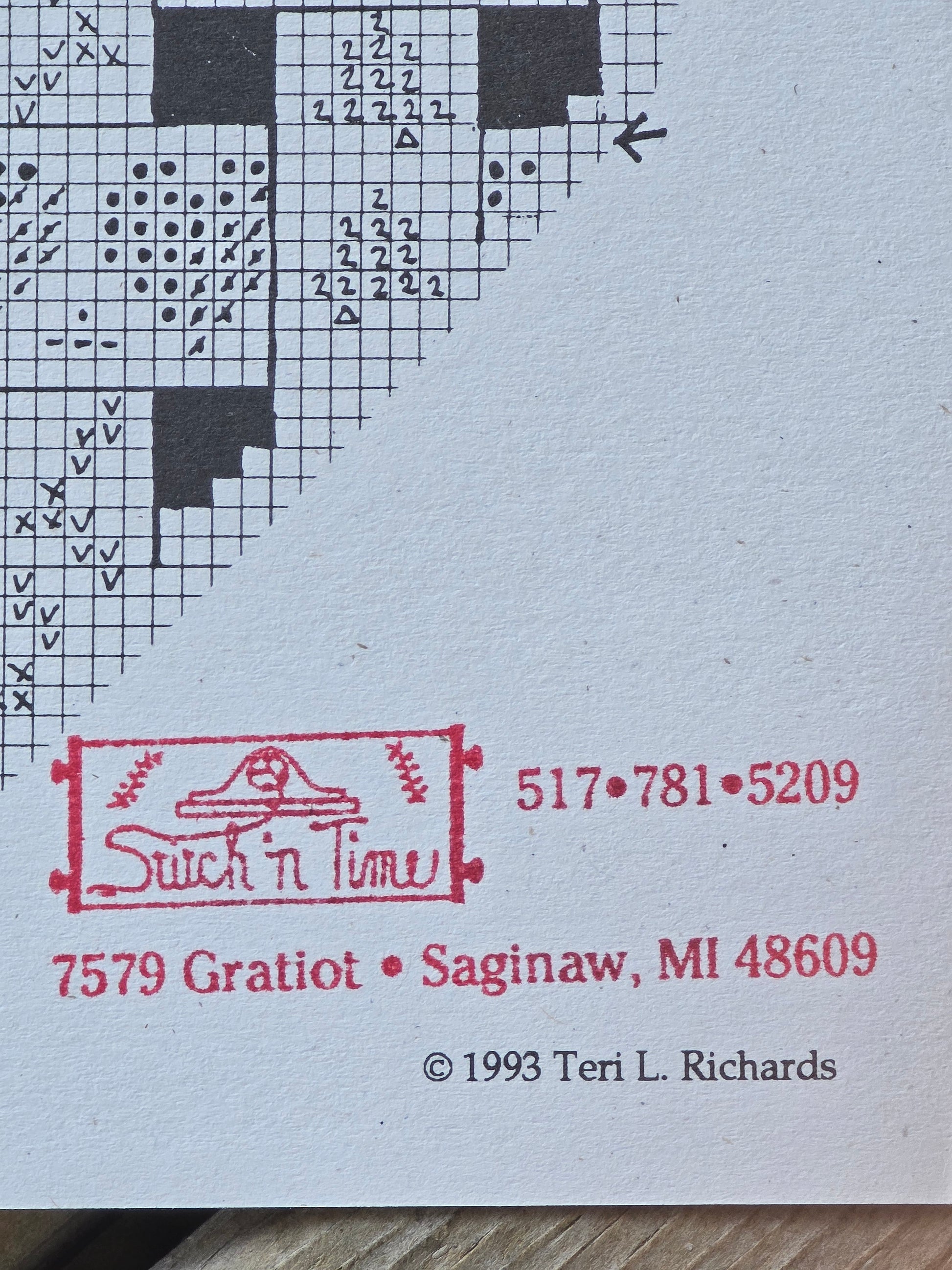 Christmas Folio cross stitch pattern. Shepherd's Bush 1993. Stitch count: Joy Tin Heart 46 x 41; Christmas Ribbons 53 x 59; Merry Christmas Wall Hanging 50 x 70; Beaded Blocks 13 x 13; Hearts & Home Pillow Stitch not listed. Estate find. Good condition. Store stamp on inside cover. Small bends in bottom left corner.