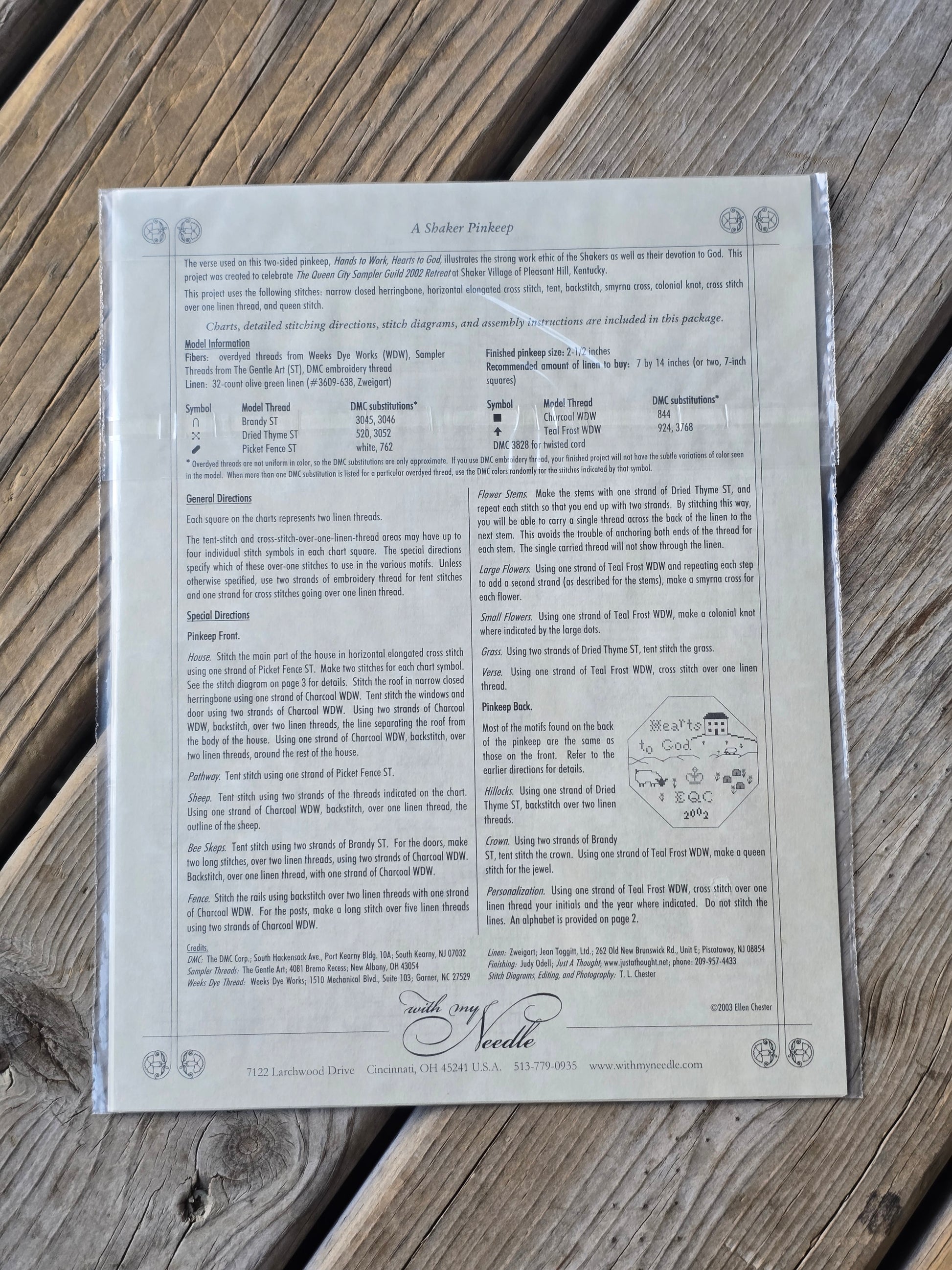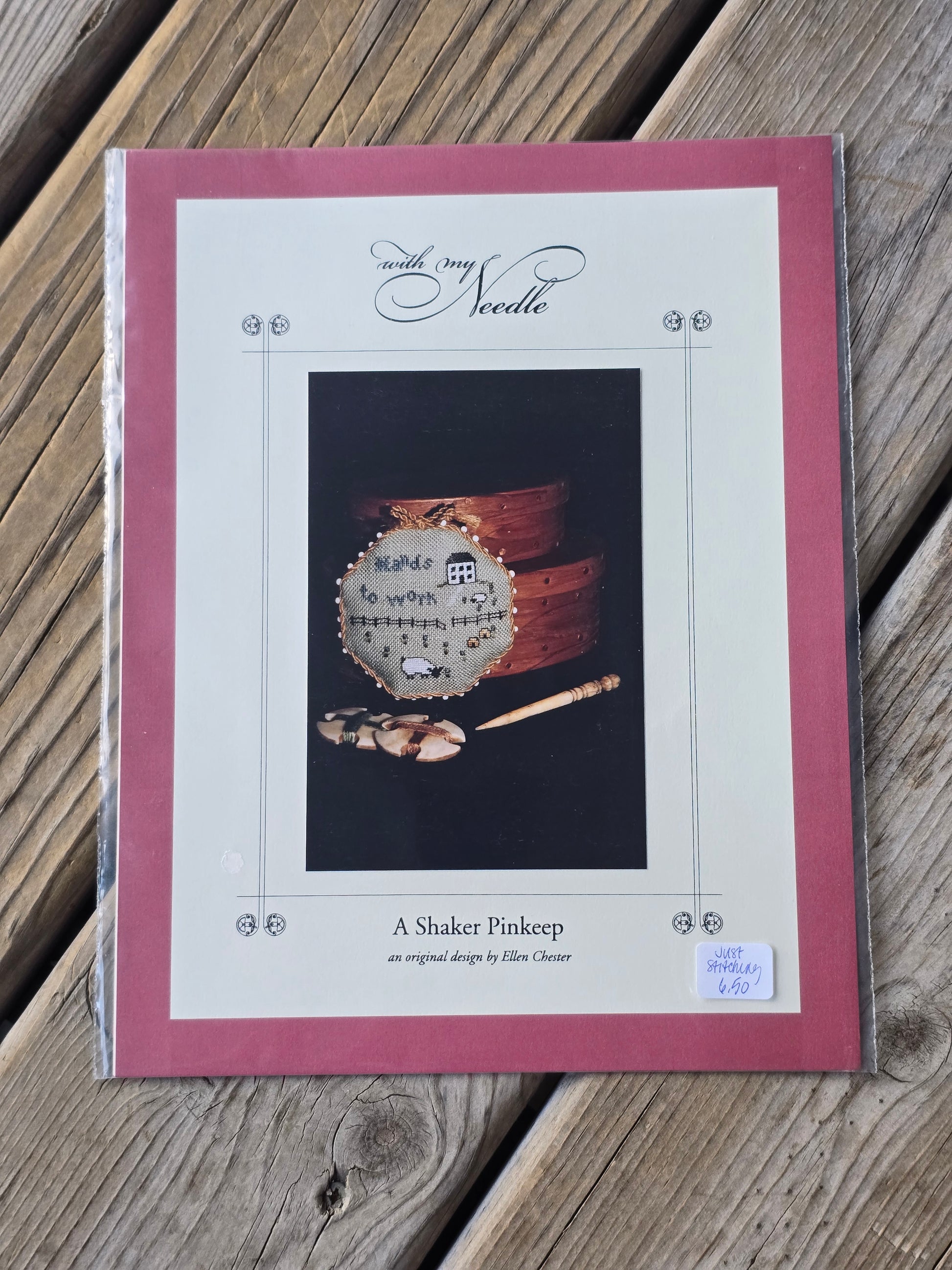 A Shaker Pinkeep cross stitch pattern. With My Needle 2003. Estate find. Like new in original package.