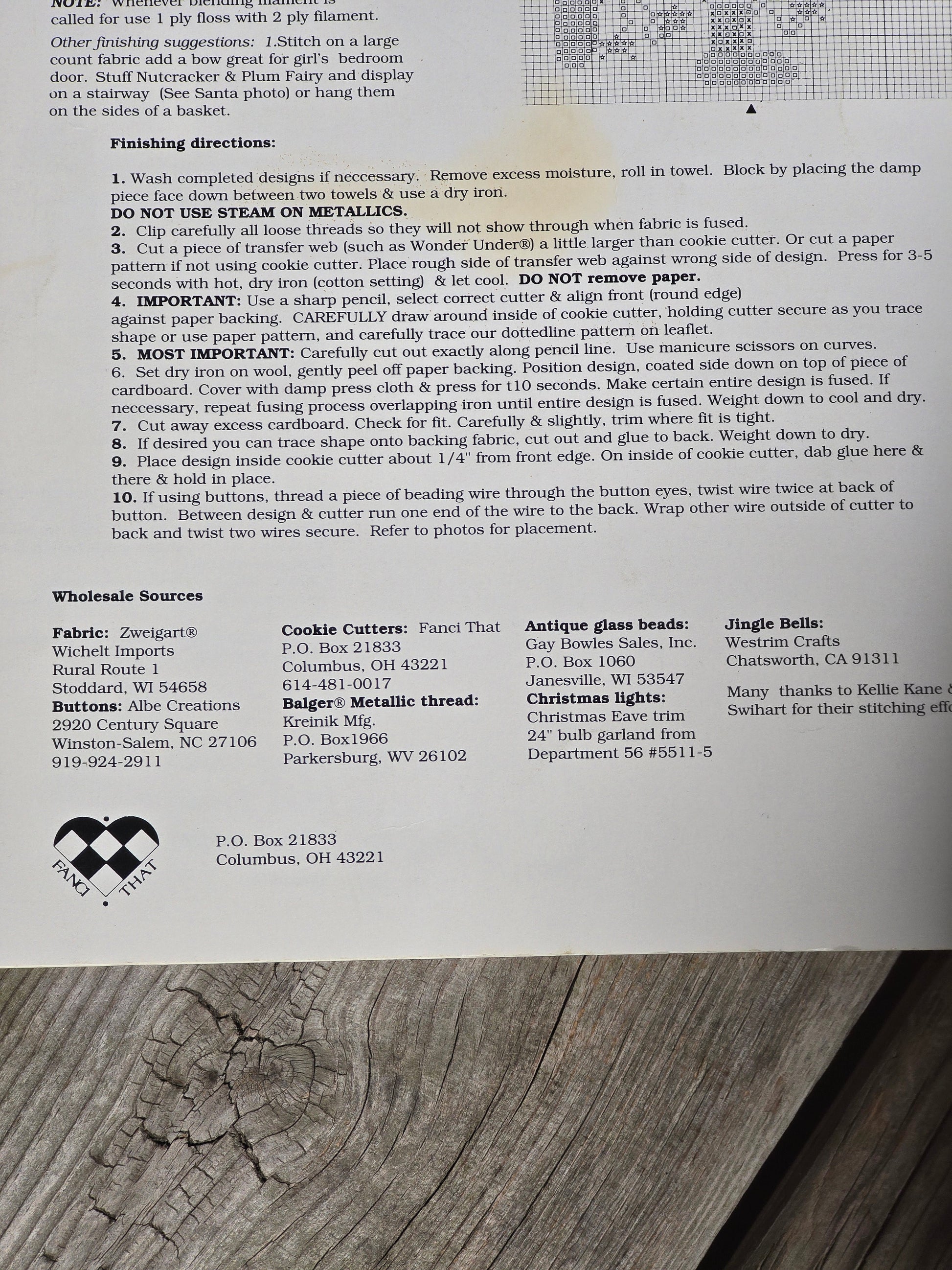 Niget Before Christmas cross stitch pattern. Fanci That 1991. Approximate stitch count: The Nutcracker 75 x 130; Saint Nick 90 x 150; Sugar Plum Fairy 58 x 76. Estate find. Fair condition. Stain on back cover. Store stamp on inside cover.