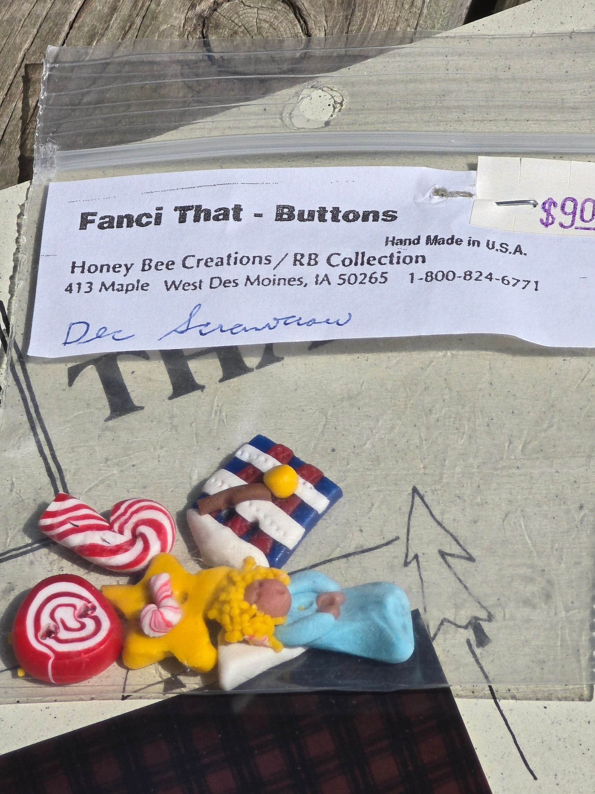 Scarecrow-December cross stitch pattern with polymer clay buttons. Fanci That 1995. Approximate design area: 104w x 127h. Estate find. Good condition. Button package stapled to cover.