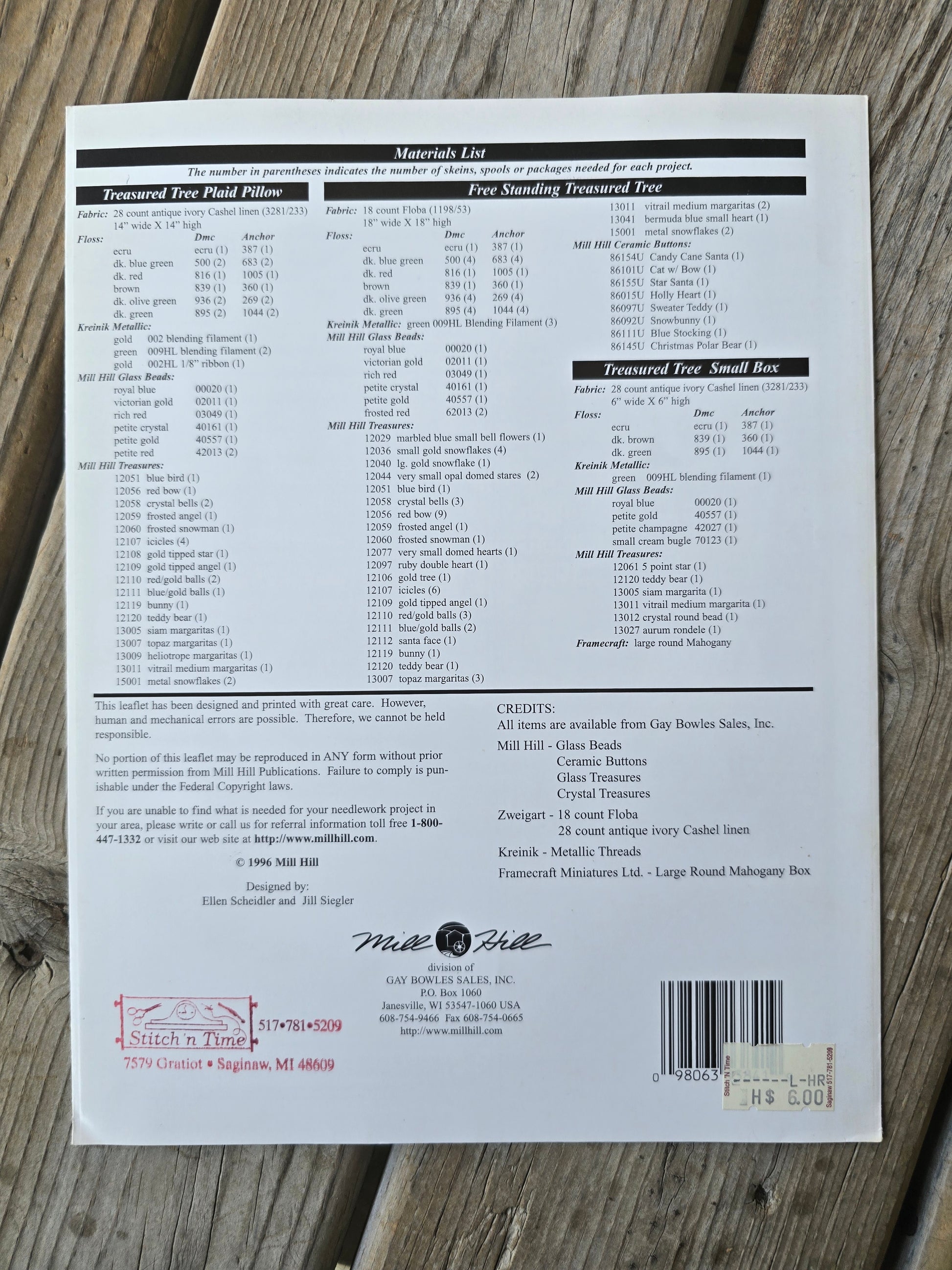 Treasured Christmas Trees cross stitch pattern leaflet. Mill Hill 1996. Estate find. Good condition. May have bends or scuffs. No torn pages or writing on pages. Store stamp on back cover. No charms.