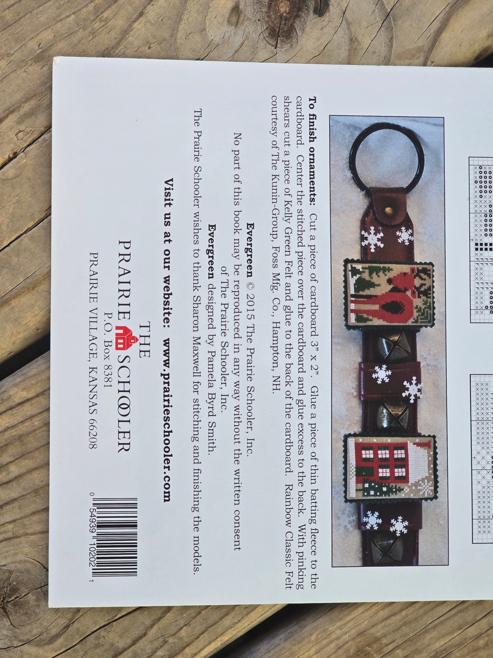 Evergreen cross stitch pattern. The Prairie Schooler 2015. Stitch count: Evergreen 155h x 107w, Ornaments 47h x 31w. Estate find. Good condition. May have wear on edges and corners.
