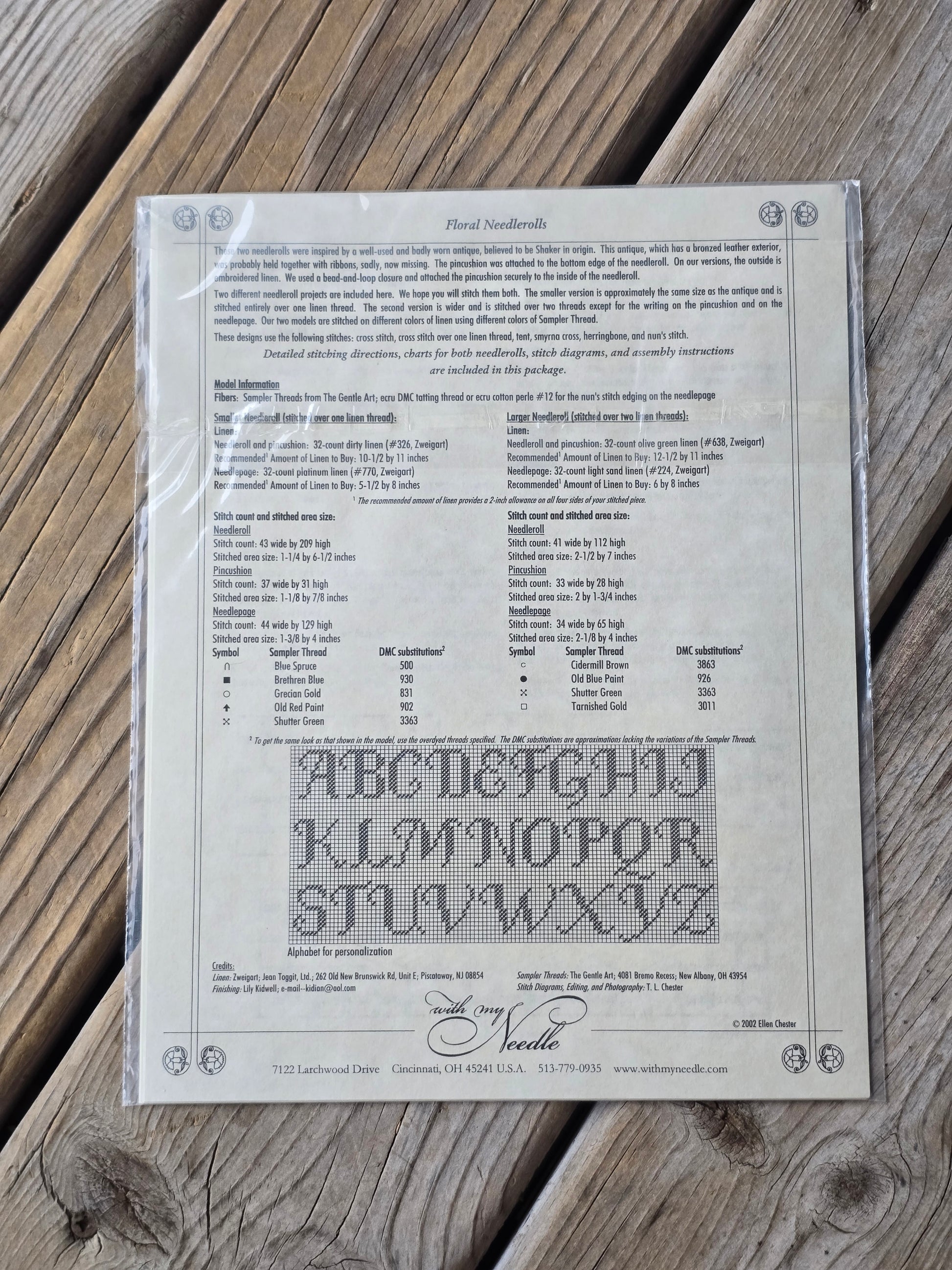 Floral Needlerolls cross stitch pattern. With My Needle 2002. Stitch count: Small needleroll 43w x 209h, Small pincushion 37w x 31h, Small needlepage 44w x 129h, Large needleroll 41w x 112h, Large pincushion 33w x 28h, Large needlepage 34w x 65h. Estate find. Like new in original package.