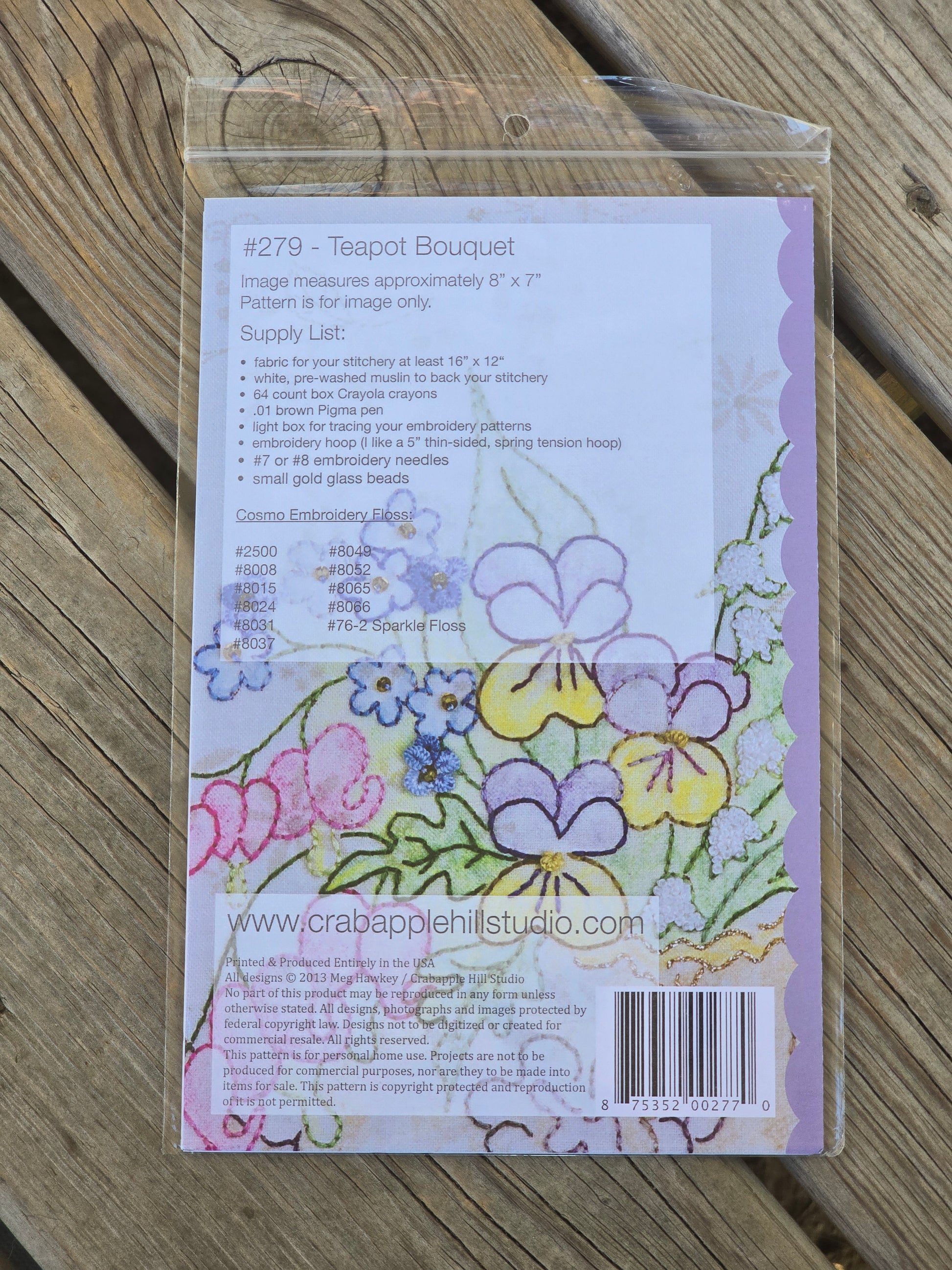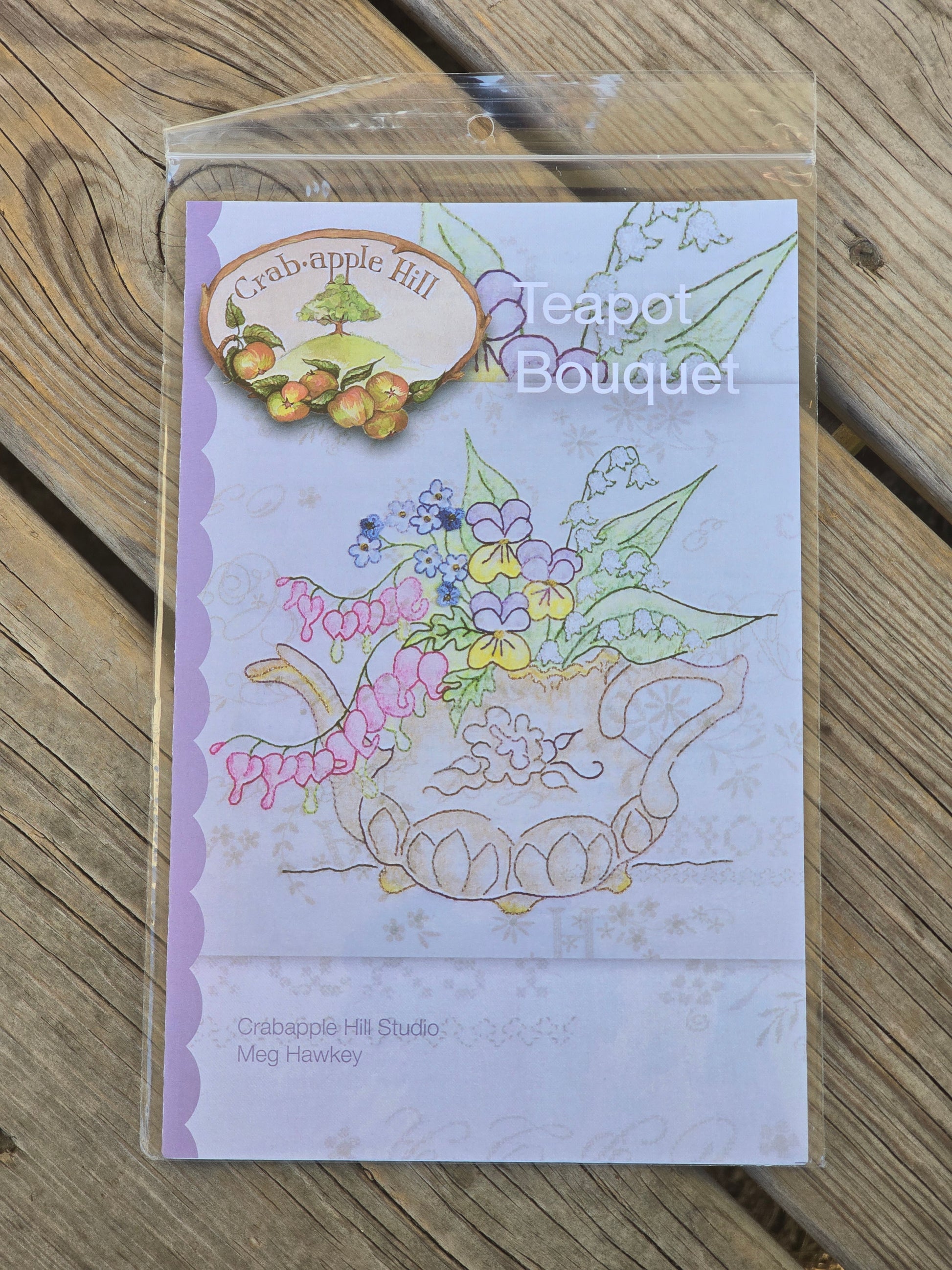 Teapot Bouquet embroidery pattern. Crab-apple Hill 2013. Imagery measures approximately 8" x 7". From a retired quilt shop. New in original package.