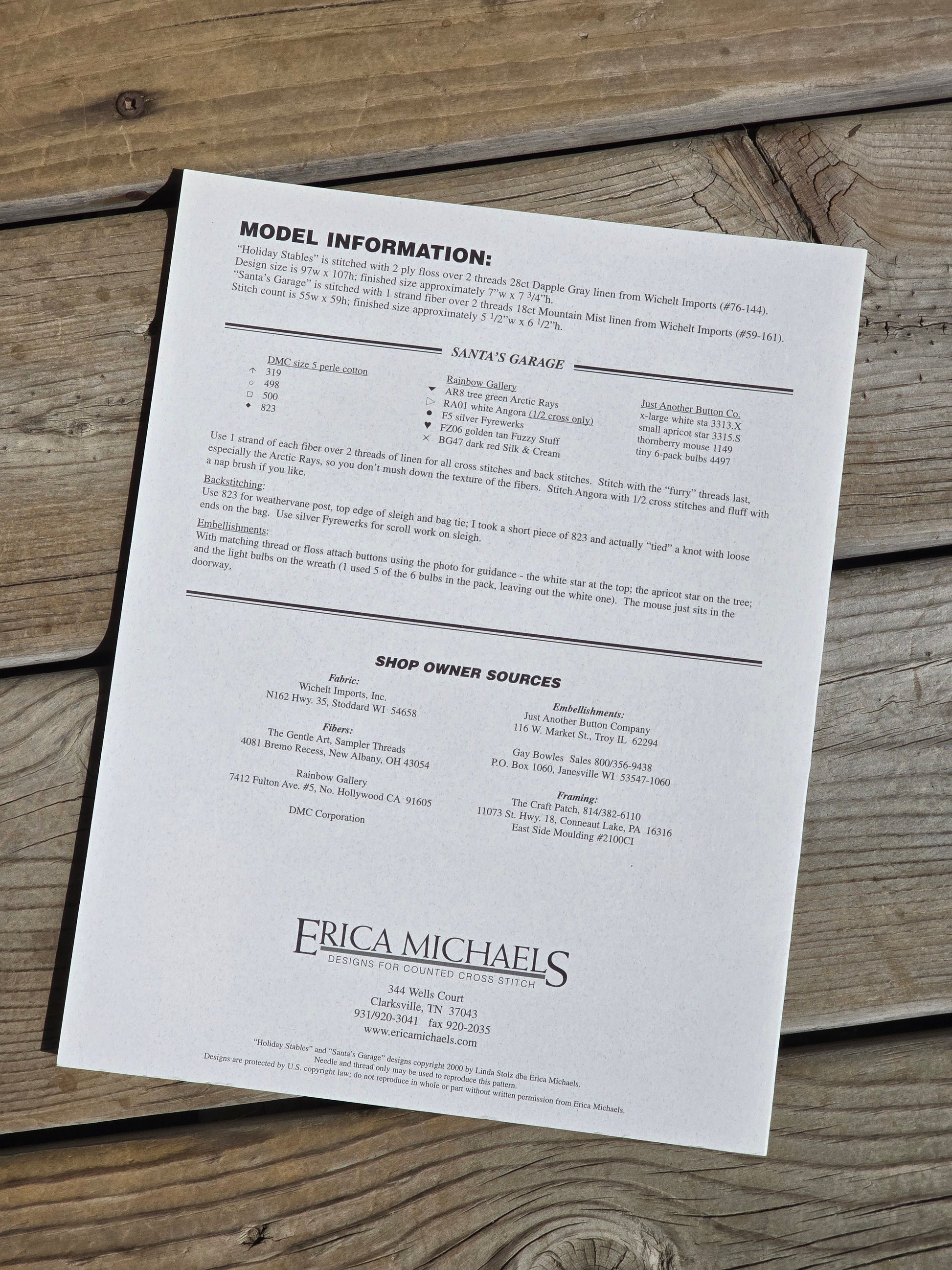 Holiday Stables cross stitch pattern. Erica Michaels 2000. Design size: 97w x 107h. Estate find. Wrinkles on bottom edge.