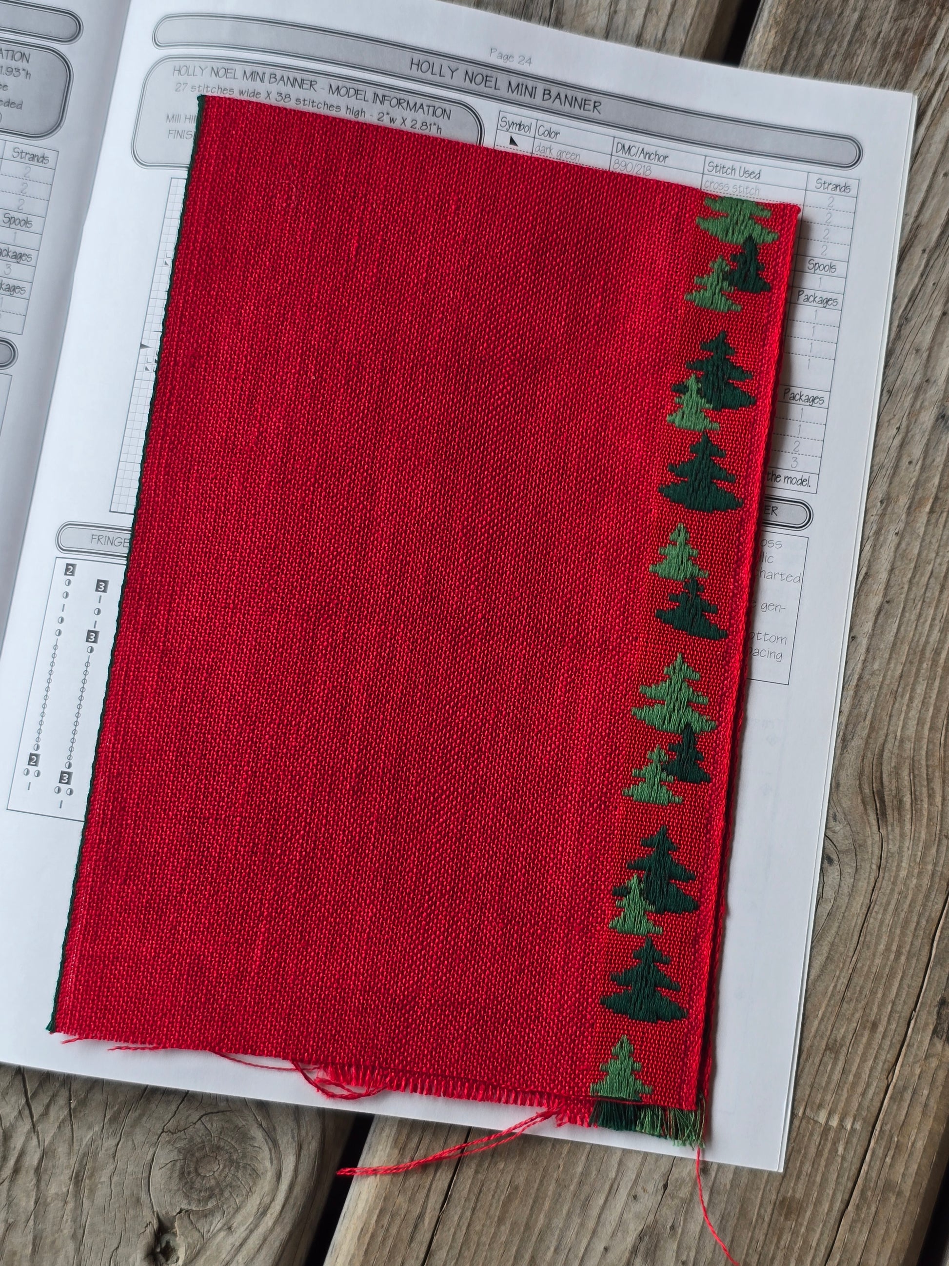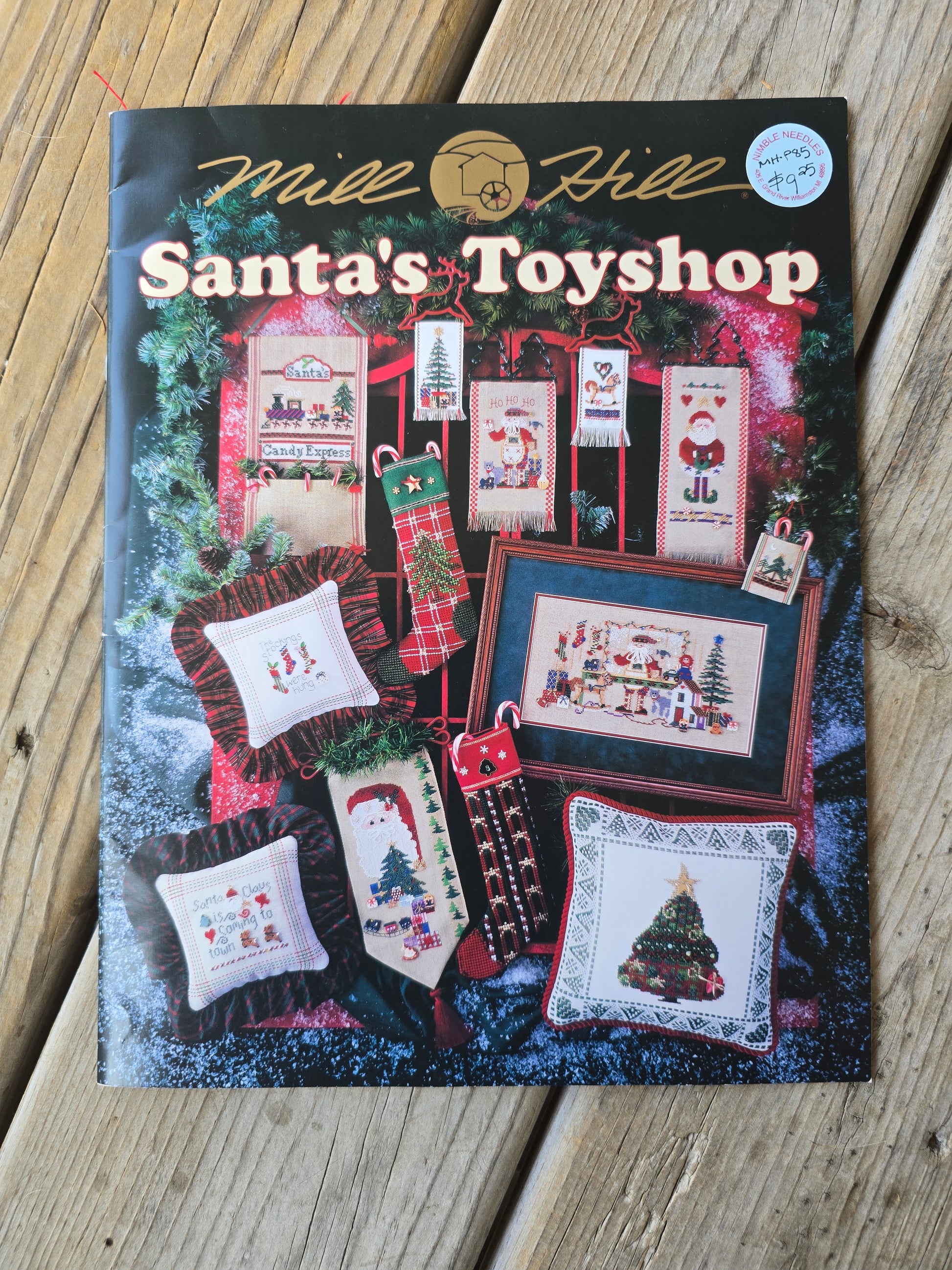 Santa's Toyshop cross stitch pattern book. Mill Hill 2001. Cross stitch pattern book with multiple patterns. Estate find. Good condition. Red cross stitch cloth with trees i serted on page 23 for the Noel cross stitch. May have bends or scuffs. No torn pages or writing on pages.
