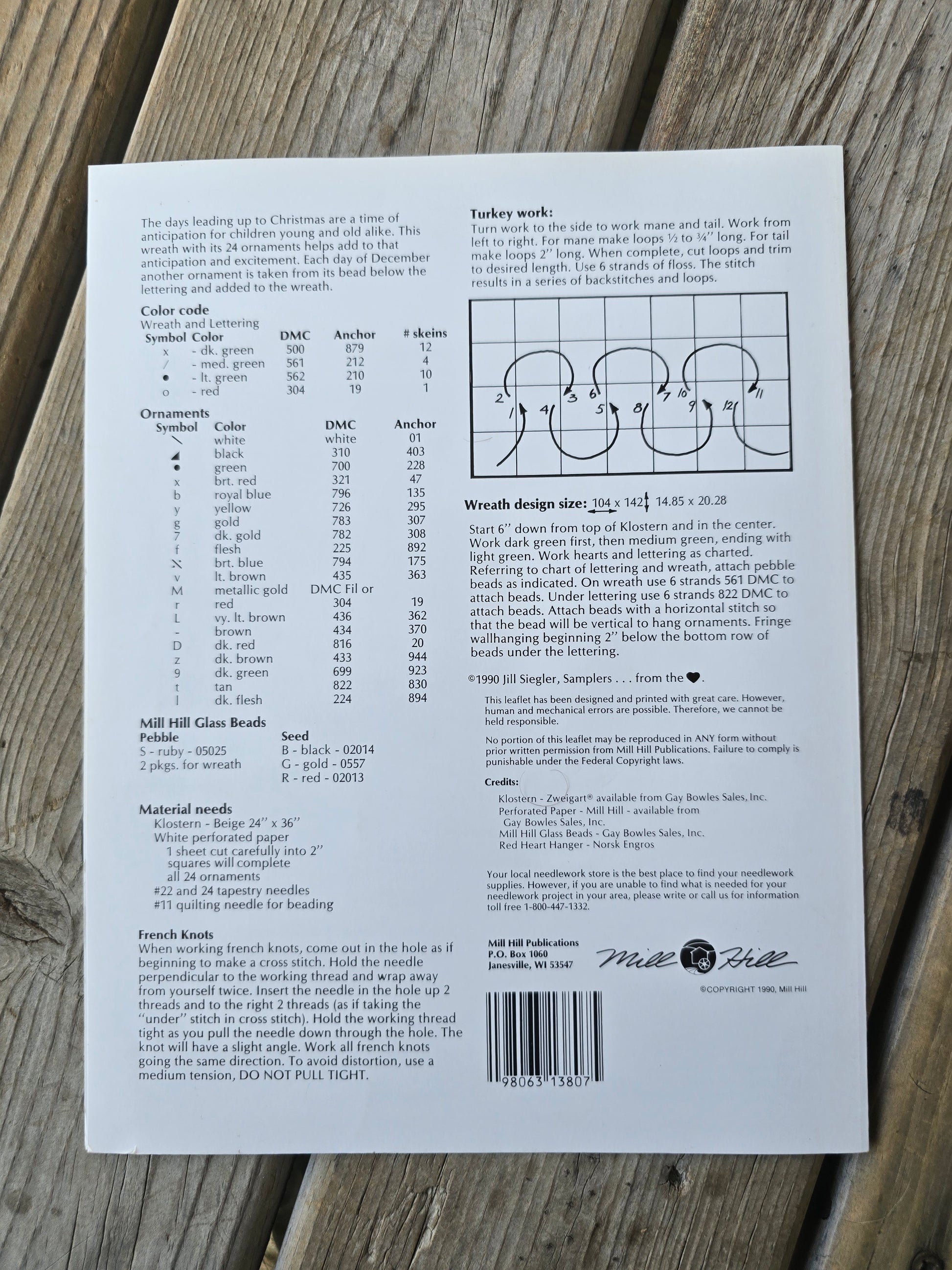 Advent Calendar Wreath cross stitch pattern leaflet. Mill Hill 1990. Estate find. Good condition. May have bends or scuffs. No torn pages or writing on pages.