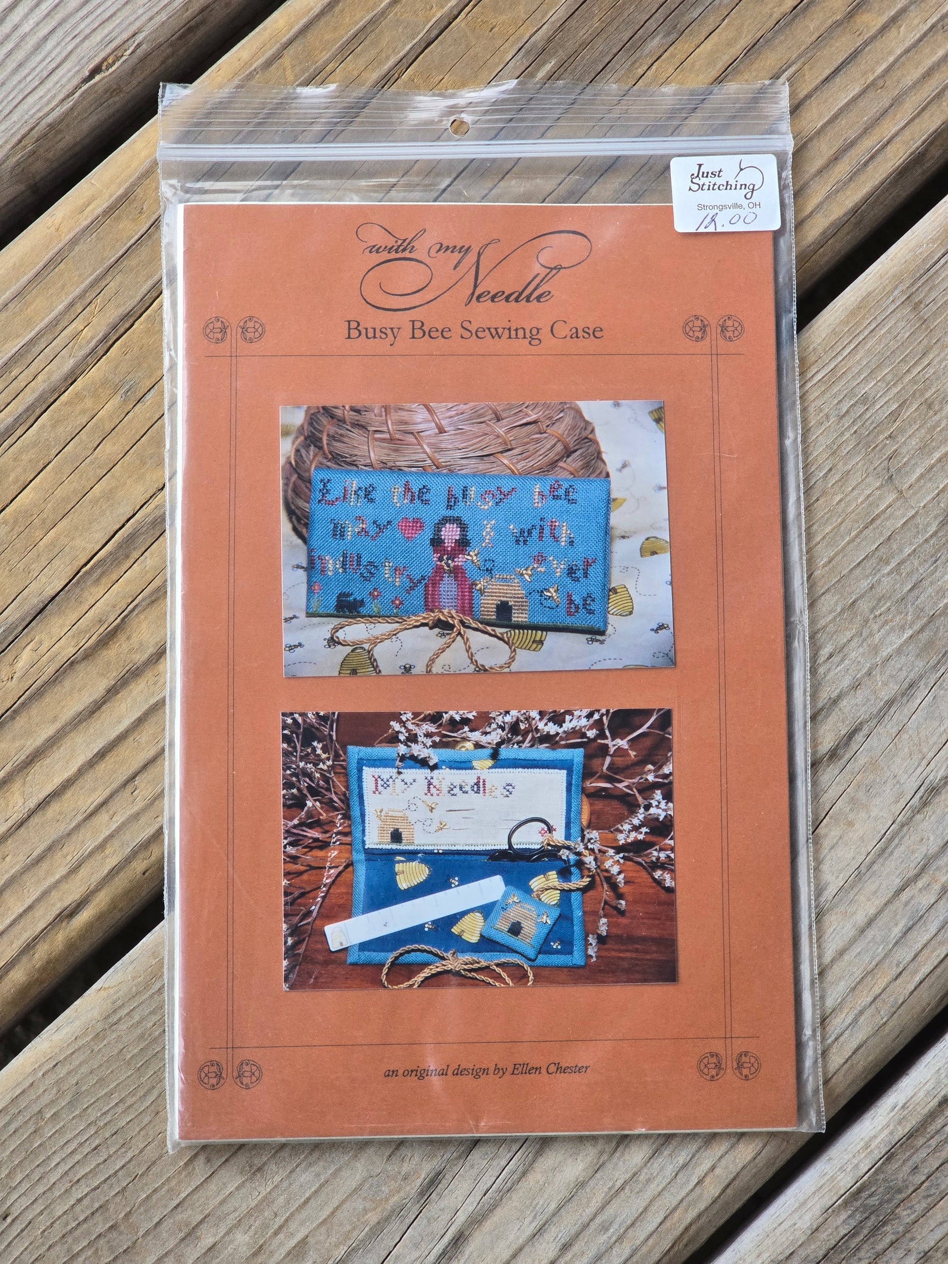 Busy Bee Sewing Case cross stitch pattern with quilters cotton. With My Needle 2000. Stitch count: Outside cover 80w x 80h, Scissors weight 21w x 21h, Needlepage 70w x 28h. Estate find. Like new in original package.
