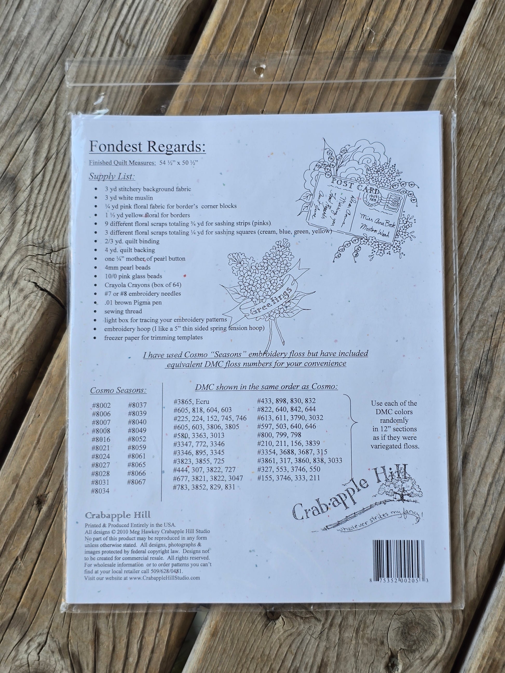 Fondest Regards embroidery and quilt pattern. Crab-apple Hill 2010. Finished size 54.5" x 50.5". From a retired quilt shop. New in original package.