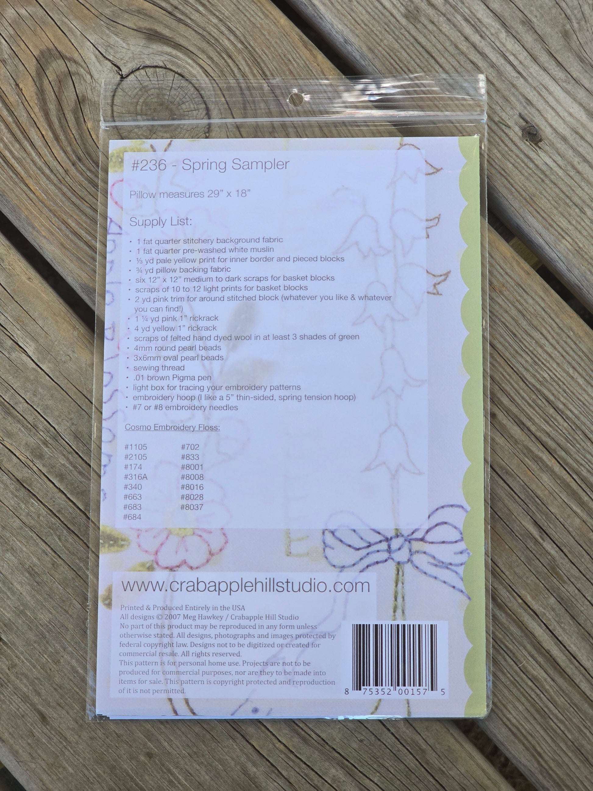 Spring Sampler embroidery and pillow pattern. Crab-apple Hill 2007. Pillow measures 29" x 18". From a retired quilt shop. New in original package.