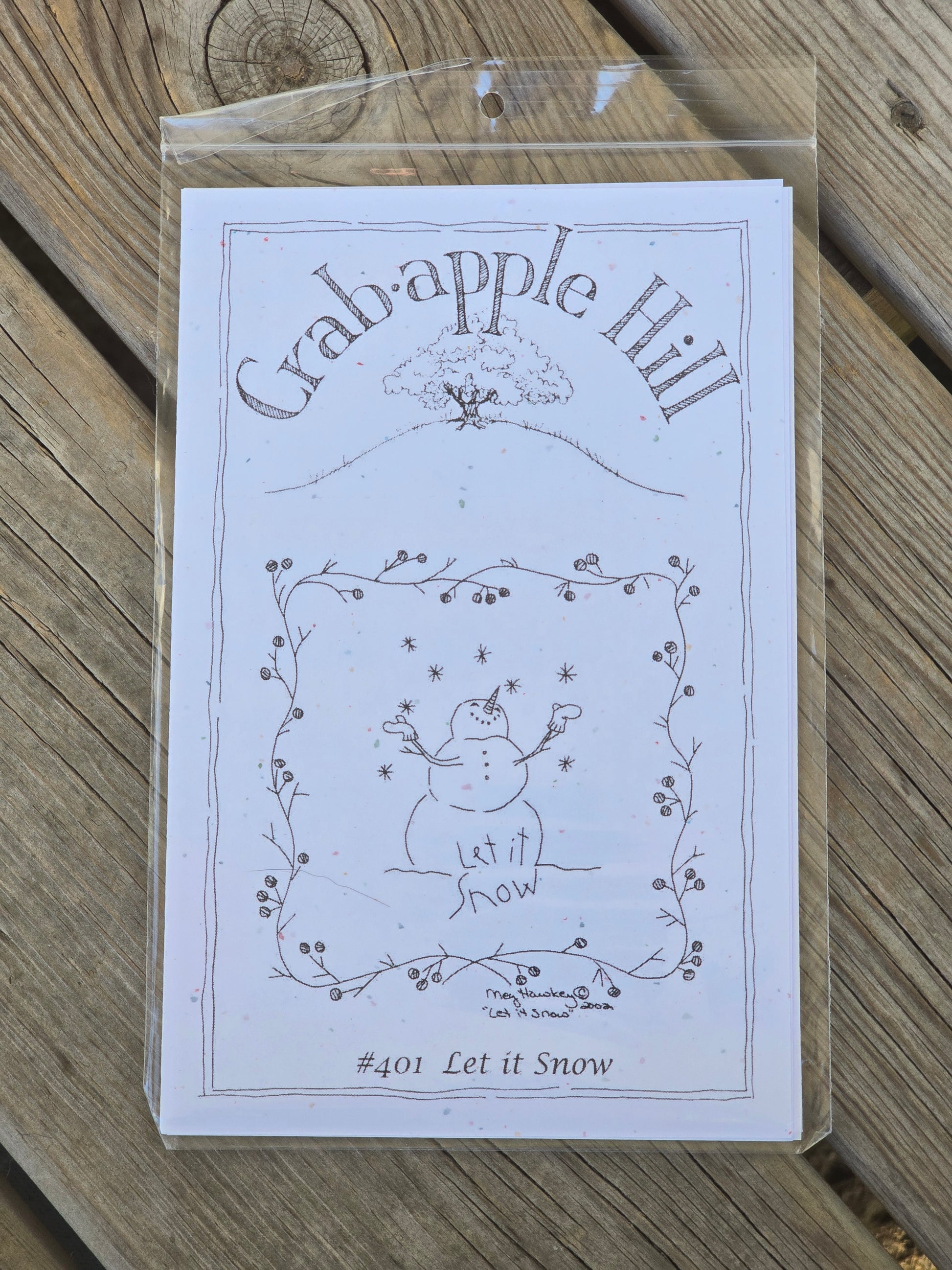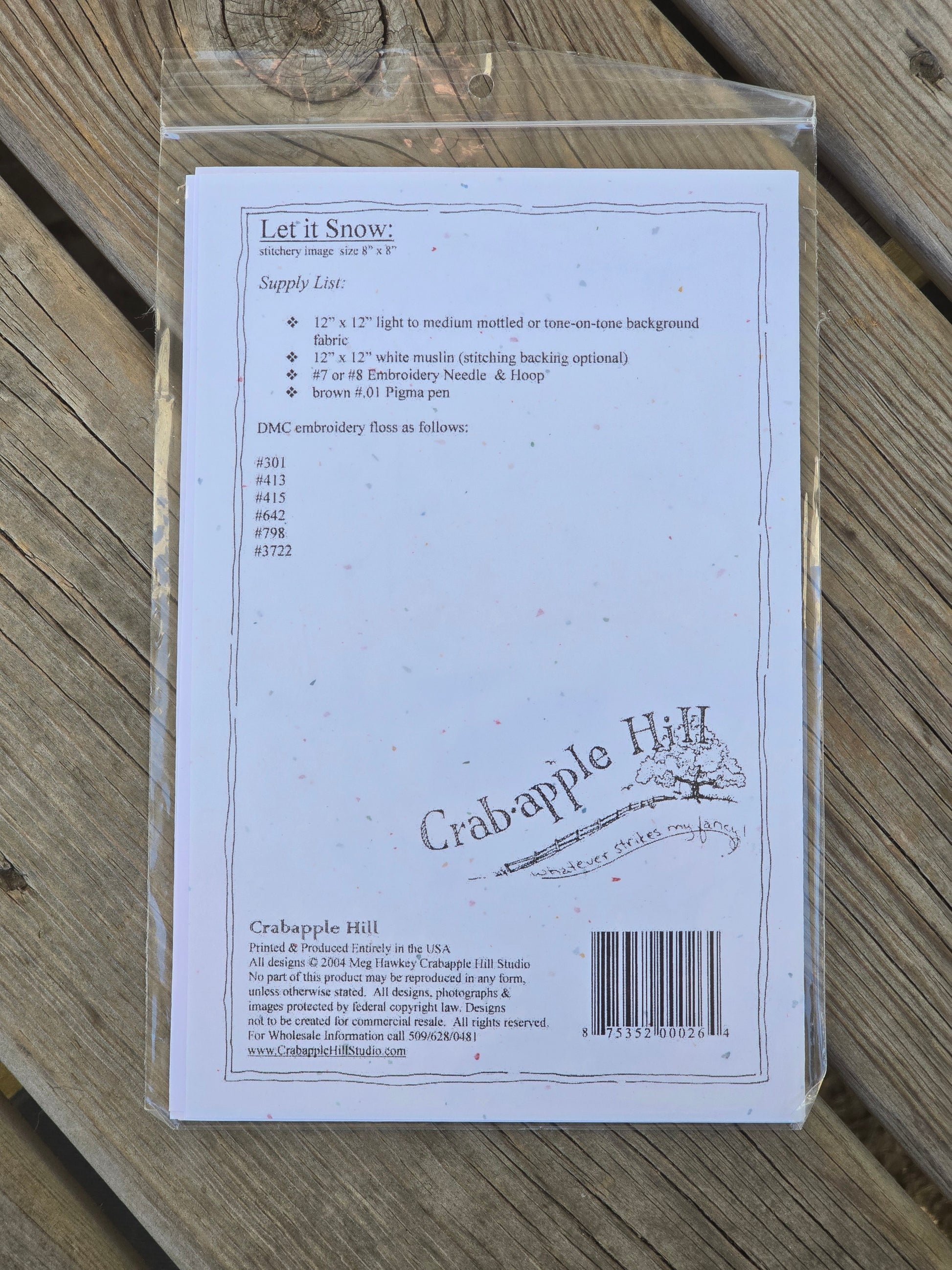 Let It Snow embroidery pattern. Crab-apple Hill 2004. Stitchery image size: 8" x 8". From a retired quilt shop. New in original package.