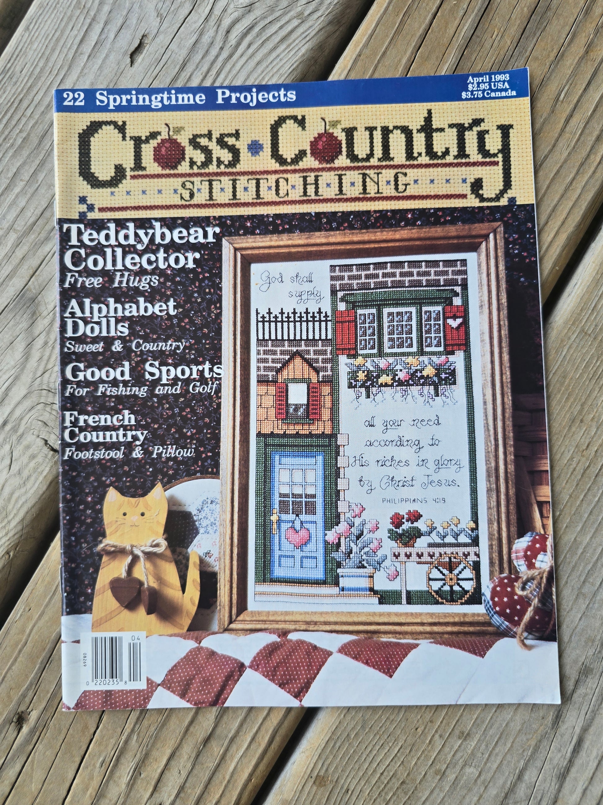 Cross Country Stitching Magazine bundle - 1993. Bi-Monthly: February, April, June, August, October, and December 1993 issues. August issue has corrections sheet stapled to page. December issue has small spot on outside edge of one page.